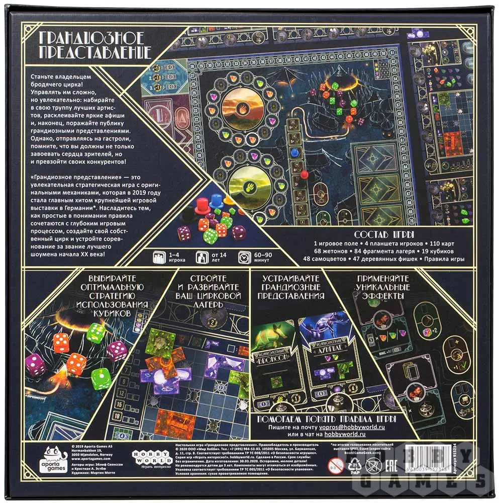 "Грандиозное представление" – это скрупулёзно проработанная евро-игра, прекрасно нарисованная французским иллюстратором Мартином Моттэ, события которой происходят в магическом мире. Шикарное оформление и смешения популярных механик сделал игру хитом выставки SPIEL Essen 2019, по итогам зрительского голосования.
