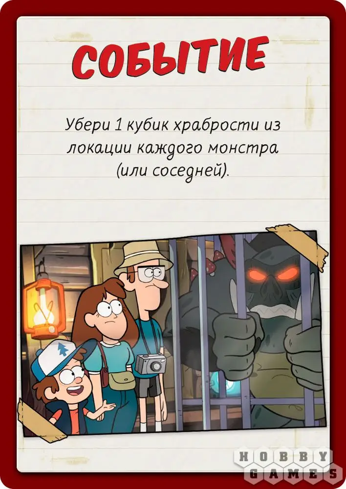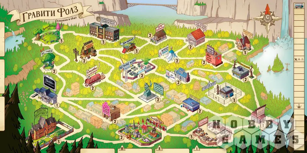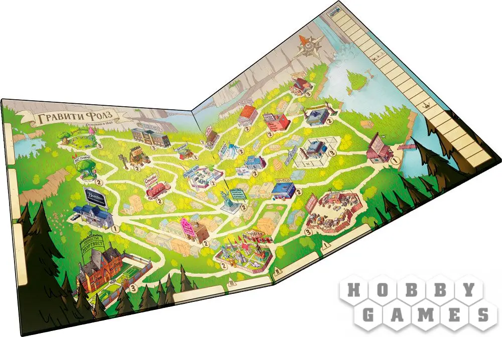 В этой кооперативной игре для 1 – 5 игроков вам предстоит путешествовать по Гравити Фолз, защищать его от монстров и убеждать горожан помочь вам. С каждым ходом от монстров всё больше бед, и доверие к игрокам падает. Чтобы не допустить этого, вам нужно победить их до того, как маркер тревоги достигнет предельного значения.