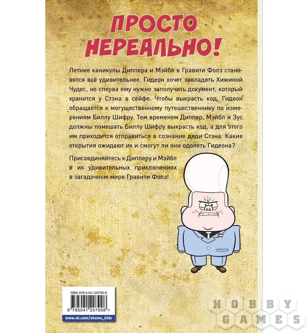 Графический роман "Гравити Фолз" – настоящая находка для любого из десятков тысяч фанатов мегапопулярного анимационного сериала, который идет на телеканале Disney. Сюжеты 13, 14 и 15 серий первого сезона в формате комикса порадуют и тех, кто давно и серьезно "подсел" на истории о приключениях Диппера и Мэйбл, и тех, кто только знакомится с ними. Сборник комиксов по 13-й, 14-й и 15-й сериям первого сезона "Гравити Фолз" отпечатан на мелованной бумаге, поэтому на иллюстрациях внимательный читатель наверняка заметит много интересного – такого, чего просто нельзя увидеть, глядя сериал по телевизору. А встреча с любимыми героями на страницах книги даст возможность еще раз пережить их захватывающие приключения: читатель узнает, как Мэйбл стала боссом в Хижине Чудес и чем это закончилось, как Диппер с Венди работали спасателями, а Мэйбл удалось на самом деле спасти Русалдо.