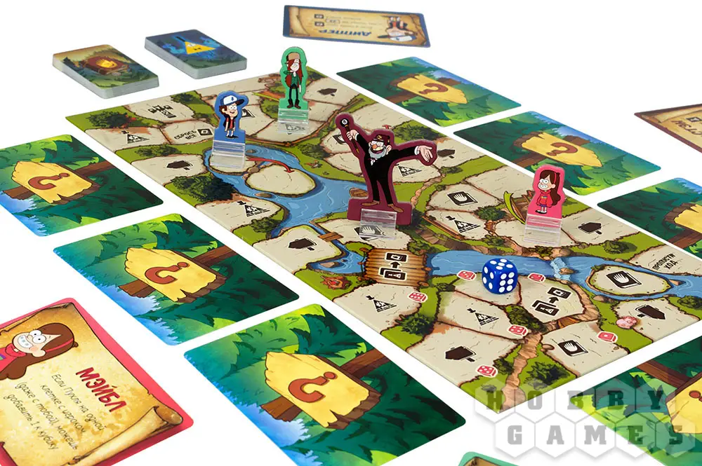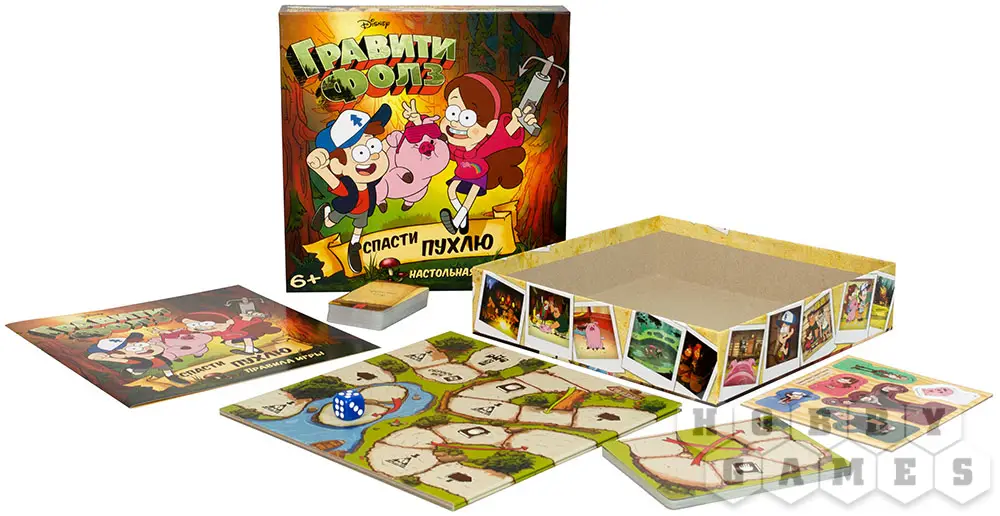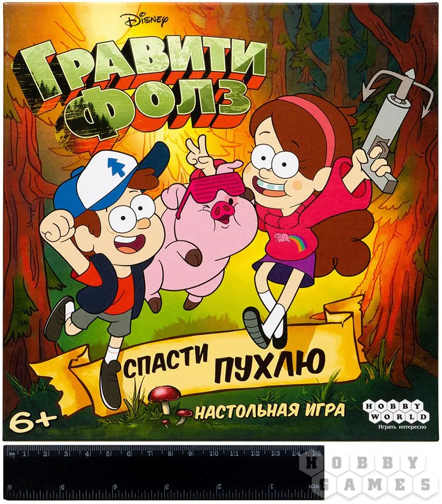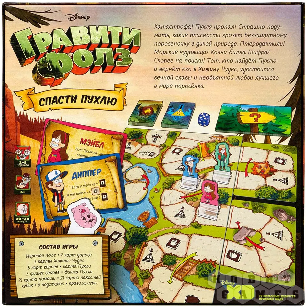 В настольной игре "Гравити Фолз: Спасти Пухлю" участники по очереди бросают кубик и передвигают свои фишки. Перемещаясь по клеткам и выполняя действия, указанные на картах, игроки, рано или поздно, находят пропавшего поросёнка.