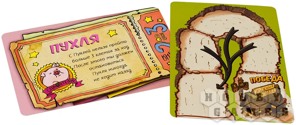 Разумеется, самым позитивным событием в игре является спасение пропавшего поросёнка. В тот момент, когда игрок остановился на клетке с указателем и открыл карту дороги, он бросает кубик. Ура! Пухля нашёлся! Теперь осталось только добраться до него, и, бережно подхватив на руки, отнести в Хижину Чудес. Теперь игроки будут забирать друг у друга поросёнка, стремясь быть первым, кто вернёт его домой. Это будет сделать не так-то просто, ведь с Пухлей нельзя пройти больше трёх клеток, ну и карты пакостей никто не отменял!
