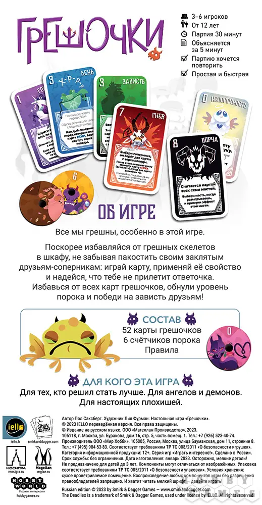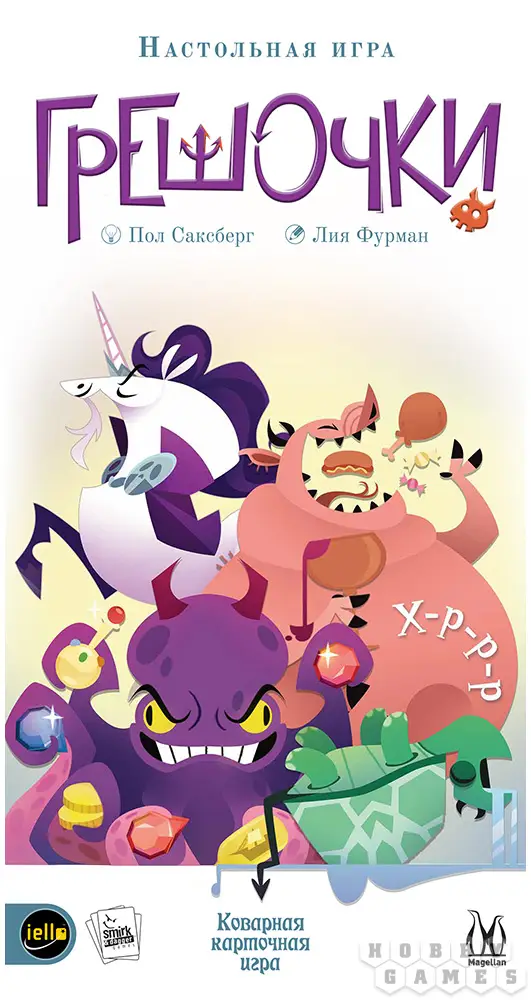 "Грешочки" – это весёлая карточная игра для компании от 3 до 6 человек. А ещё она простая, как пареная репа! В этой игре вам и остальным игрокам нужно как можно скорее избавиться от карт грехов с руки и обнулить свой уровень порока: выкладывайте карту на стол, применяйте её эффект против других игроков, и будьте готовы к тому, что "ответочка" прилетит в любое время.