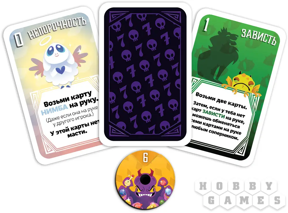 В колоде вас ждёт 52 карты грешочков: 49 карт семи всем известных грехов (мастей) разной степени тяжести (со значениями от 1 до 7), карта "Порчи", которая поможет вам усилить эффект вашей пакости, ведь она является джокером и считается картой любой масти. А ещё карта "Нимба", которая освобождает вас от карт на руках и снижает уровень порока, и карта "Непорочности", которая поможет вам получить эту самую карту "Нимба".