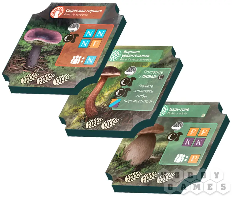 В этом делюкс-издании все картонные фигурки и жетоны заменены на деревянные. В том числе квадраты и планшеты грибов! Также в эту версию сразу включено мини-дополнение "Шёпот леса", добавляющее в игру новые карты целей и квадраты грибов. А для того, чтобы игровой процесс был более осмысленным и удобном, в состав делюкс-издания были добавлены красочный справочник по грибам и коробочки для хранения компонентов.