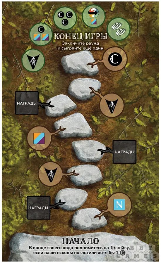 Игра продолжается до тех пор, пока один из игроков не доведёт свою сеть корней до края углеродного планшета. После этого все участники получают последнюю возможность усилить свои позиции, совершая финальные ходы. Победа достаётся тому, кто смог набрать наибольшее количество очков за время игры. После подведения итогов станет ясно, кто из вас оказался самым дальновидным и заботливым хранителем лесного царства!