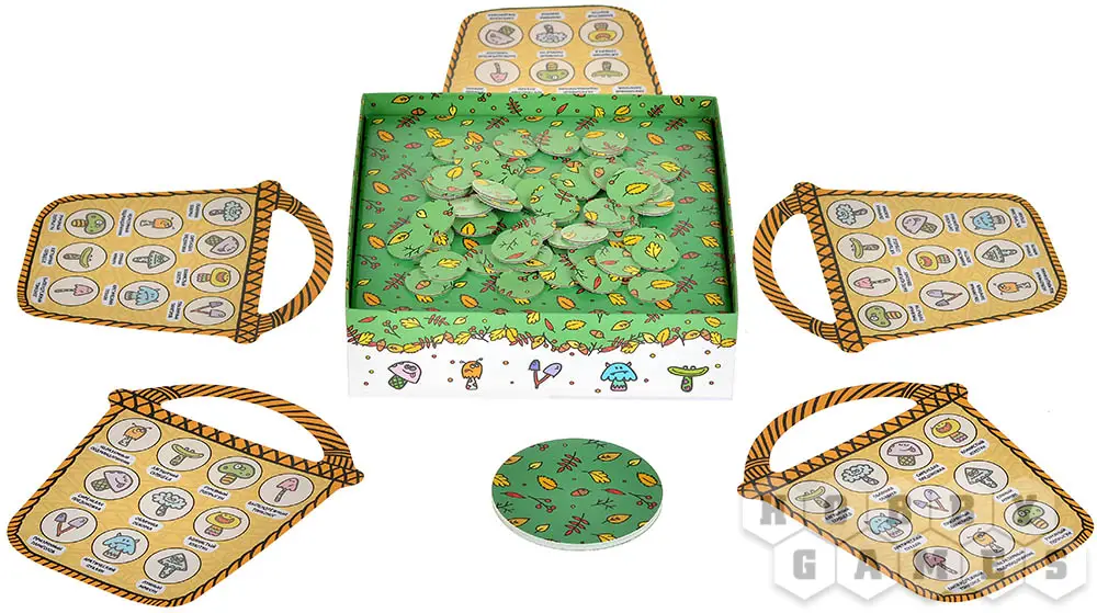 Начинаем с подготовки! Сначала выберите себе по одной корзинке-планшету и положите её перед собой. Затем высыпьте все жетоны грибов в коробку рубашкой вверх, перемешайте их рукой и разровняйте ровным слоем. Перемешайте колоду карт заданий и положите рядом.