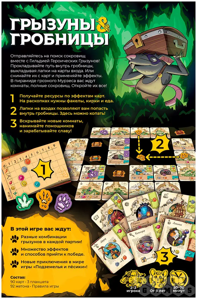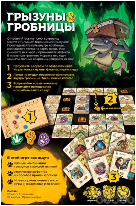 "Грызуны и гробницы" – это динамичная игра, которая перенесёт вас в загадочный мир древних пирамид. Ваша задача – быть быстрее соперников: прокладывать путь вглубь гробницы, активировать эффекты карт и собирать ценные ресурсы. Игра не даст вам заскучать ни на секунду, проверяя вашу смекалку!