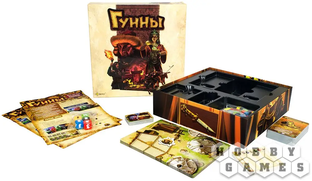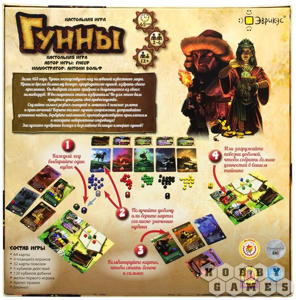 В настольной игре "Гунны" игрокам предстоит примерить на себя роли полководцев великого вождя и доказать своё право занять место предводителя. Седлайте самых лютых коней, вас ожидают головокружительные приключения и горы золота! Возьмите отменное оружие и совершайте набеги, заполняйте под завязку телеги долгожданной добычей, призывайте под свои знамёна наёмников – делайте всё возможное, чтобы заработать победные очки, которые в финале сделают вас единоличным преемником великого вождя. Если, конечно, получится обогнать по очкам остальных претендентов!