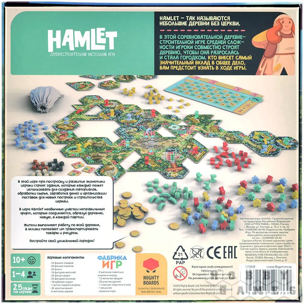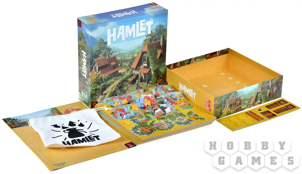 Интересный факт: словом Hamlet в британском английском языке называют небольшую деревушку без церкви. Отсюда и пошло название этой соревновательной настольной игры, в которой вам вместе с остальными игроками предстоит развивать деревню, присоединяя к ней новый участки земли и строя на них различные производственные здания.