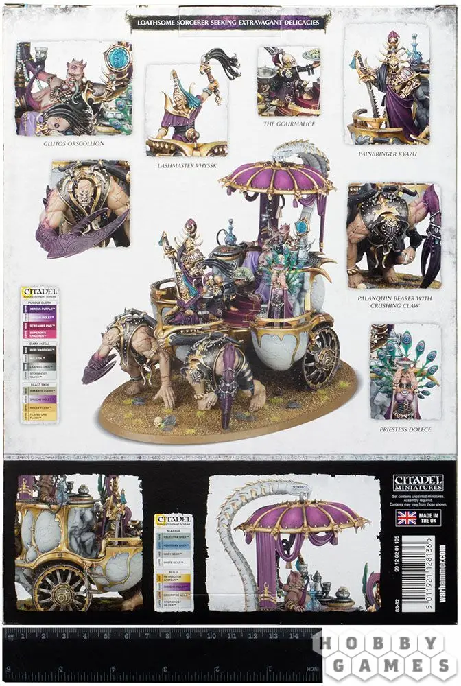 В наборе вы найдёте 101 компонент, необходимый для сборки Глутоса Орсколлиона на прекрасном паланкине и его любимых слуг. В комплект входит 170-миллиметровая овальная подставка.