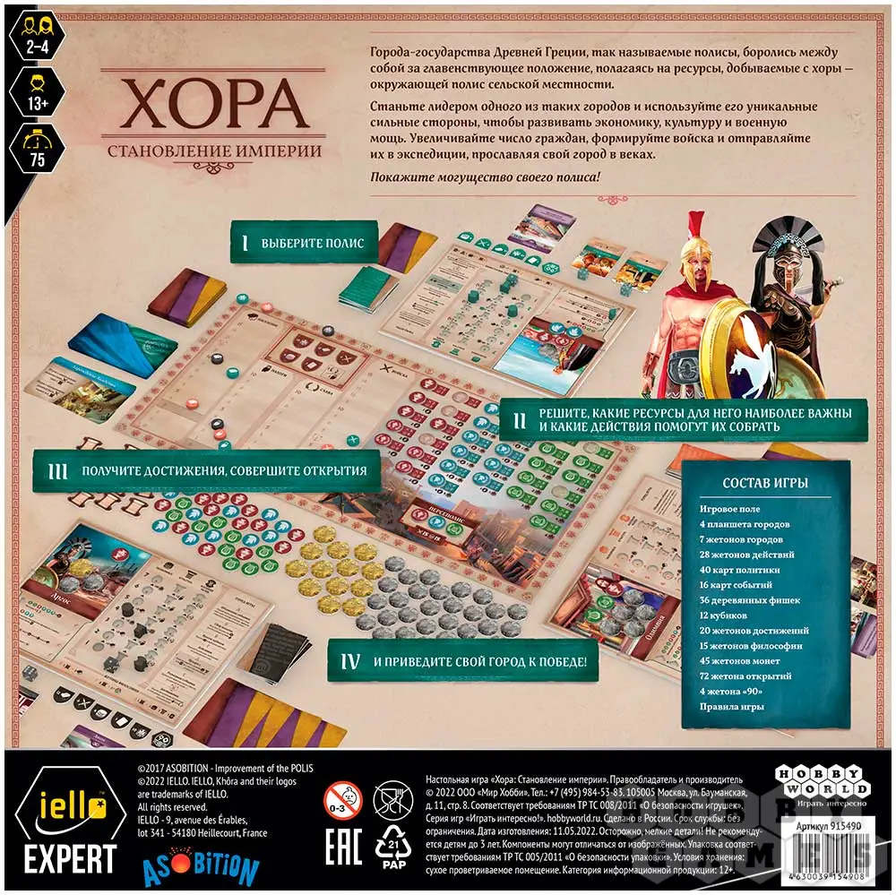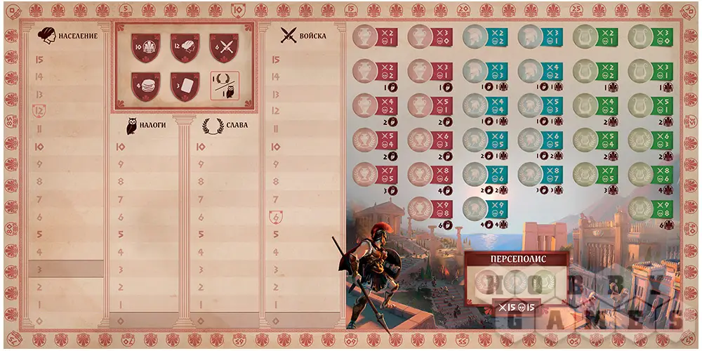 Полисы бесконечно долго враждовали между собой, соревнуясь за главенствующее положение среди остальных городов. В этой борьбе за развитие наибольший упор делался на хору; так называлась сельская местность, находящаяся в окружении полиса. И именно хора поможет вам привести свою империю к процветанию в этой настольной игре.