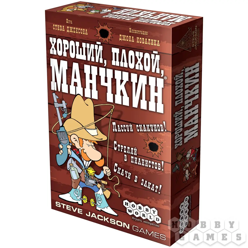 "Хороший, плохой, Манчкин" – это новая версия всемирно популярной серии настольных игр "Манчкин". В неё вы можете играть самостоятельно или же смешать с любыми другими колодами "Манчкина", чтобы получить смесь с безумством Дикого Запада. Эту версию игры точно оценят любители фильмов про Индиану Джонса и ковбоев, а искромётный юмор Стива Джексона и узнаваемые рисунки Джона Ковалика не оставят равнодушным ни одного Манчкина!
