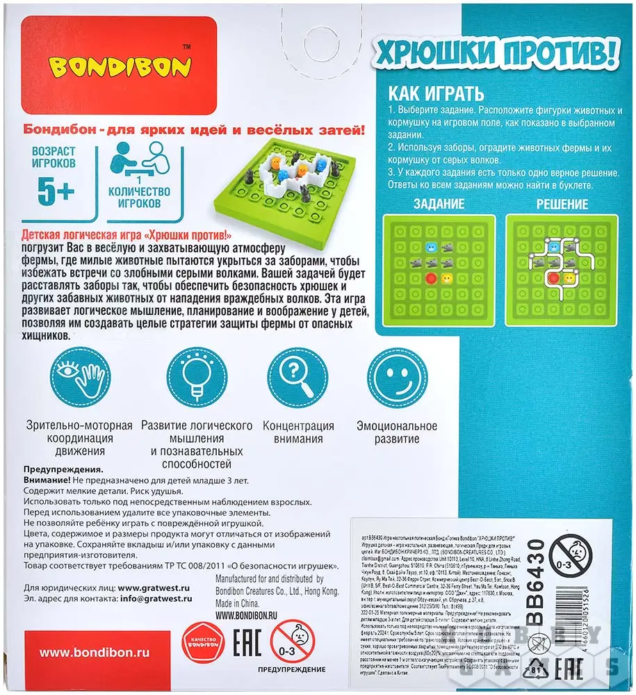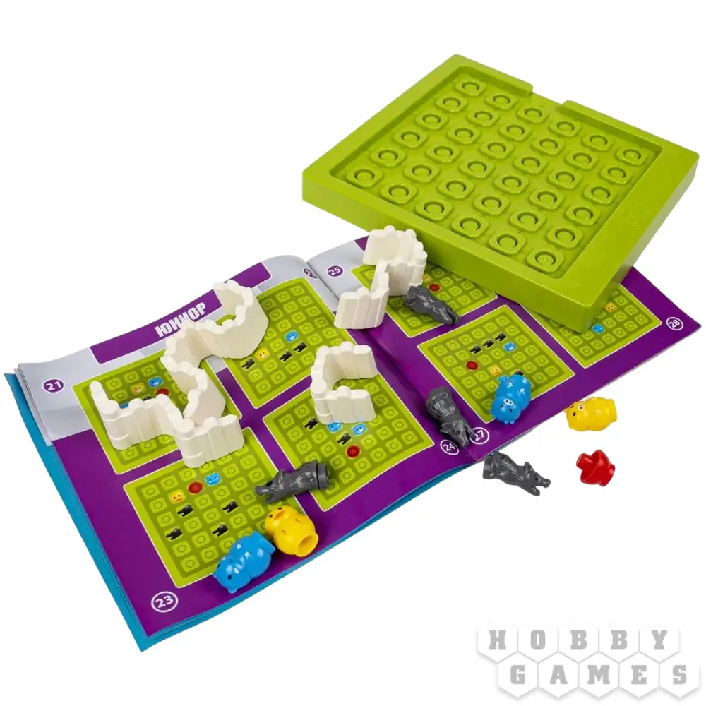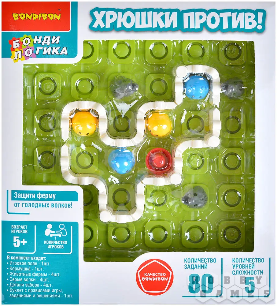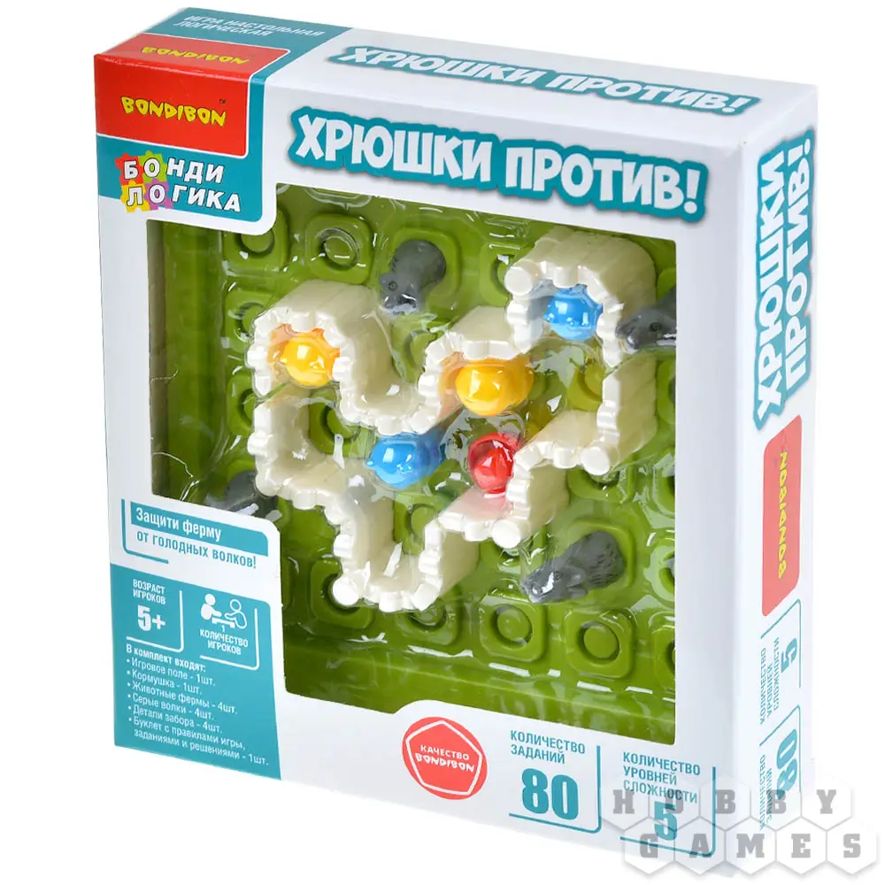 "Хрюшки против!" – игра-головоломка для самых маленьких, которая надолго увлечёт вашего ребёнка и при этом поспособствует развитию у него логического мышления. Ваша цель – таким образом выставить на поле забор, чтобы отгородить фермерских животных от опасных волков, пришедших на вашу территорию. В комплекте идут 80 заданий разного уровня сложности. В соответствии с выбранным заданием расставьте на поле фигурки и приступайте к возведению забора! Единственное условие – животные и их кормушка должны быть огорожены со всех сторон, а вот волки наоборот – должны иметь хотя бы один путь отступления. Справитесь?