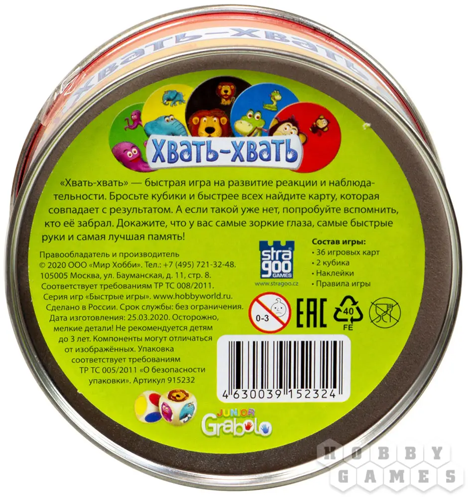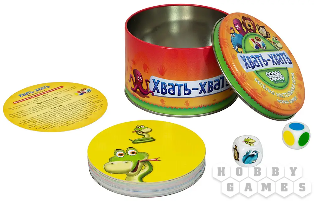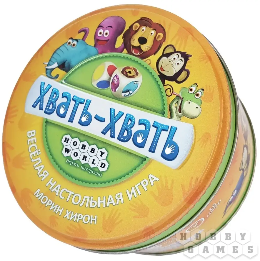 "Хвать-хвать" – очень простая и занимательная настольная игра для самых маленьких любителей настолок. В этой игре вам необходимо быстро находить различных животных определённых цветов и хватать их быстрее, чем ваши соперники, а также не забывать, кто и кого уже хватал.