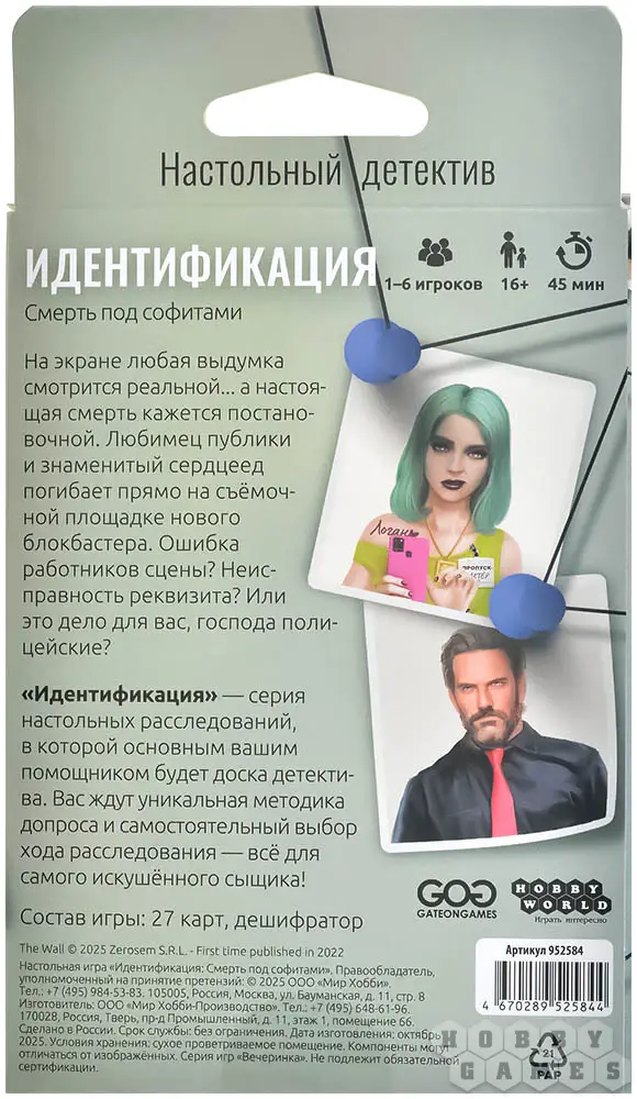 "Смерть под софитами" – ещё одна часть детективной серии "Идентификация", в которой вам предстоит провести расследование. А помощь в нём вам сослужит классическая доска детектива! Вы сами сможете решать, в каком направлении пойдёт расследование, а для самых искушённых сыщиков в игре предусмотрена уникальная методика допроса.
