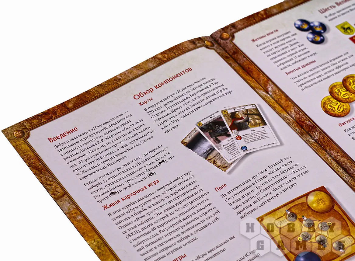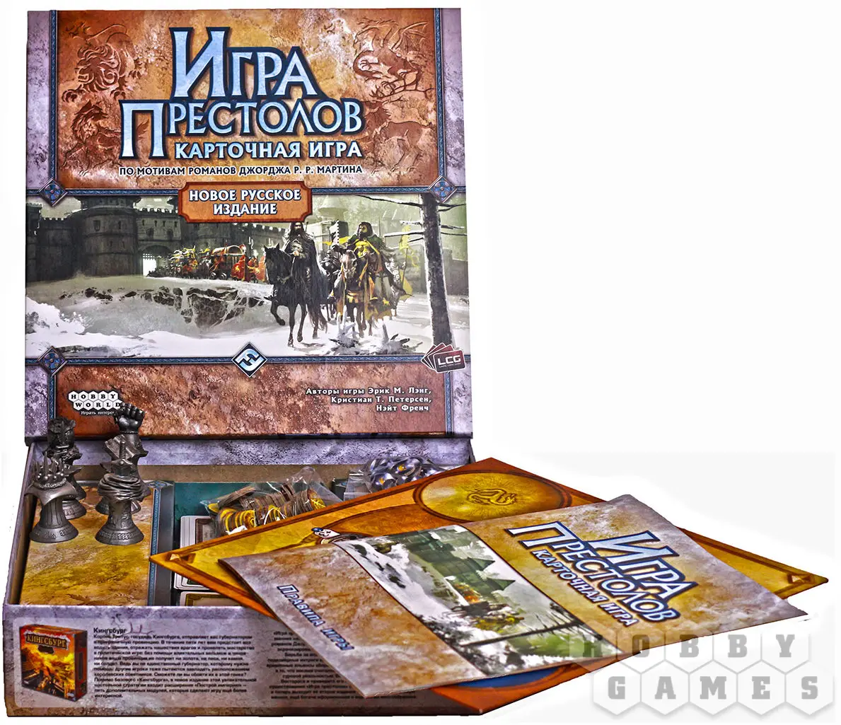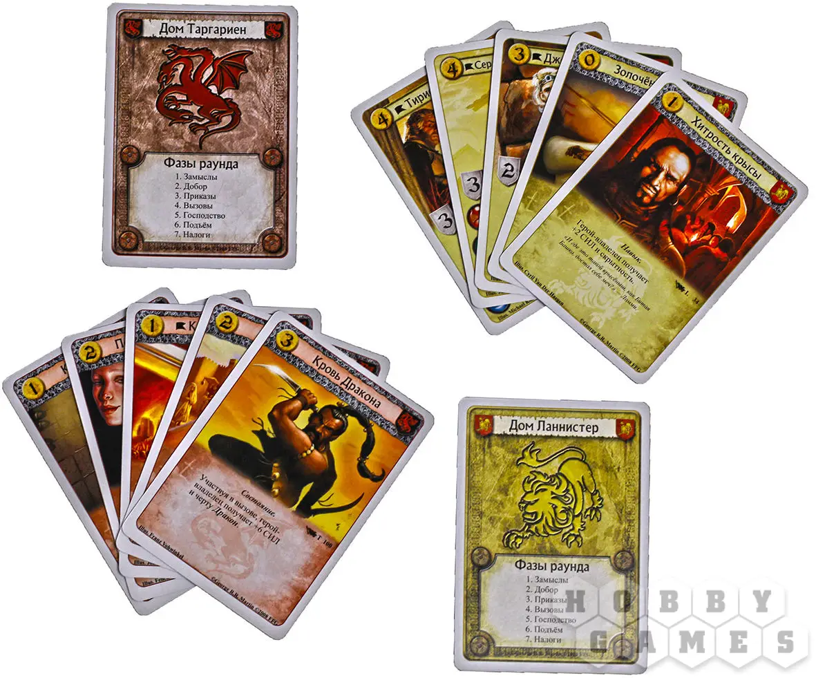 В Игре престолов содержится 220 карт, разбитых на 4 колоды. Начать первую партию сразу же после вскрытия коробки. Основные колоды: Дом Старков, Баратеонов, Ланистеров и Таргариенов – дополняются карточками еще двух Великих домов – Мартелов и Грейджоев, а также справочными карточками по титулам.