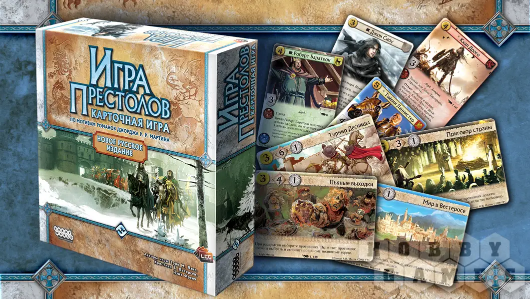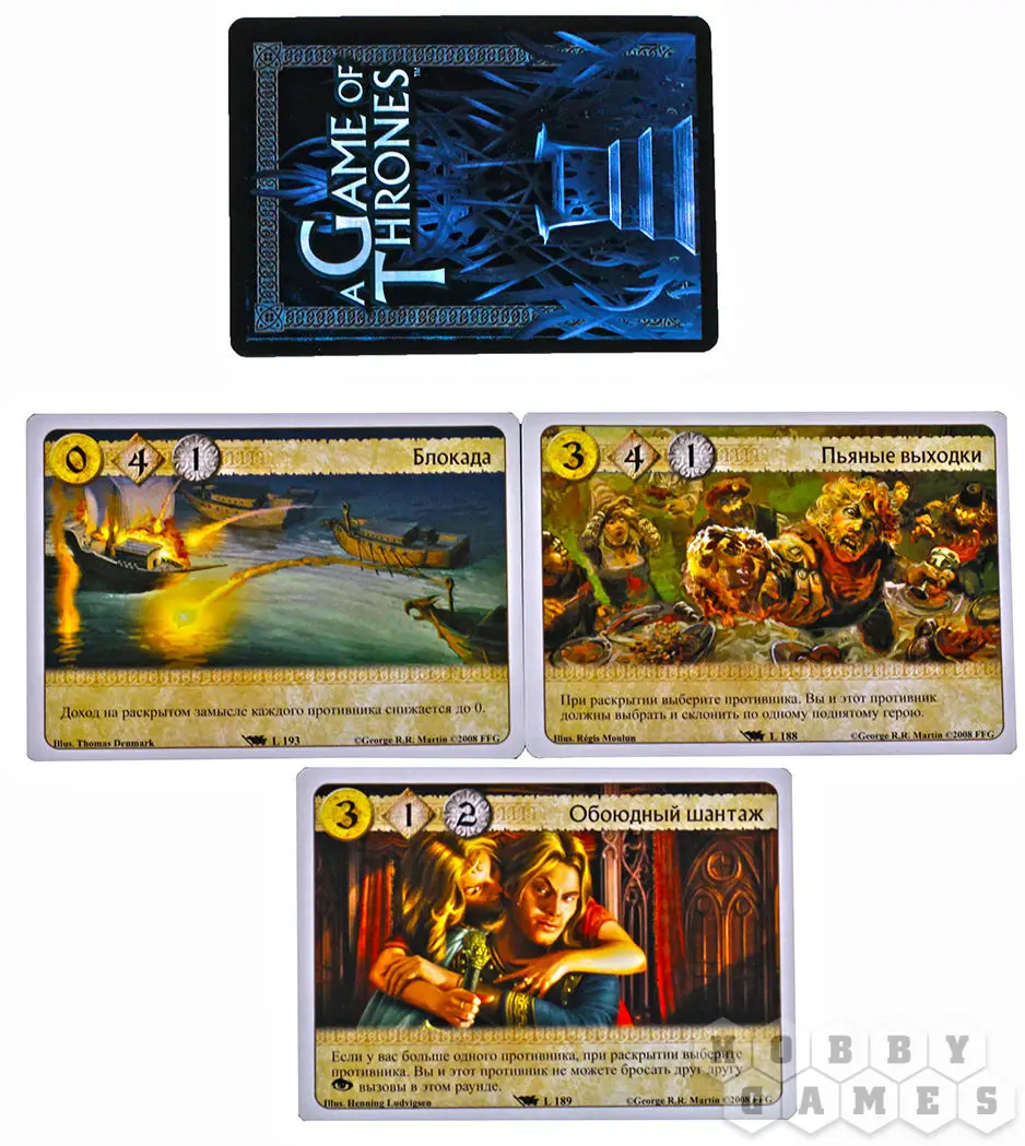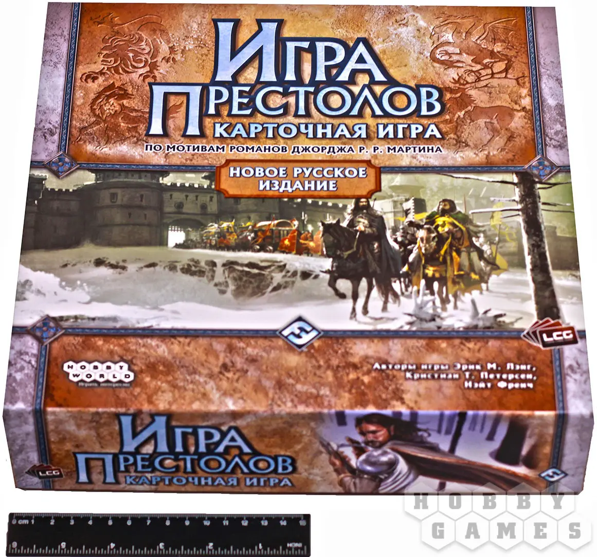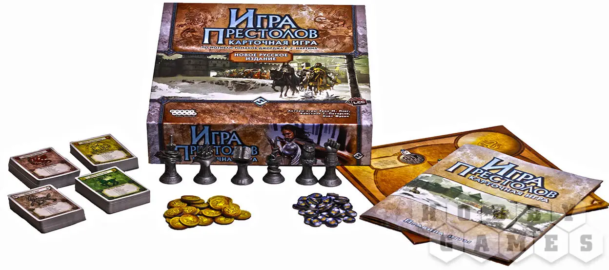 В Игре престолов содержится 220 карт, разбитых на 4 колоды. Начать первую партию сразу же после вскрытия коробки. Основные колоды: Дом Старков, Баратеонов, Ланистеров и Таргариенов – дополняются карточками еще двух Великих домов – Мартелов и Грейджоев, а также справочными карточками по титулам.