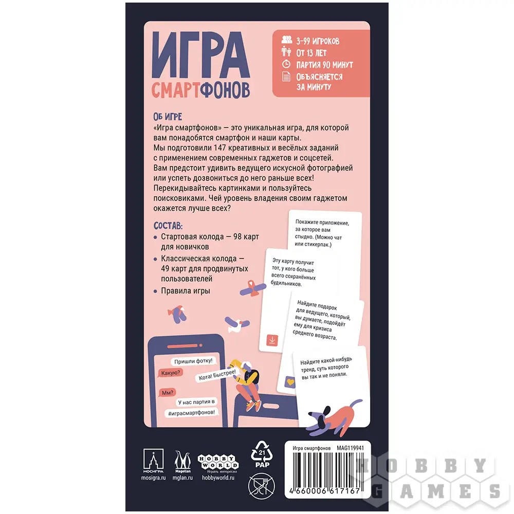 Если в других настольных играх вы стараетесь концентрироваться на том, что происходит на столе, "Игра смартфонов" перенесёт фокус в совсем другое место – на экраны ваших телефонов! В ходе этой игры вы будете делать селфи, копаться в своих сообщениях, обсуждать тренды, оставлять записи в "Заметках" и многое другое.