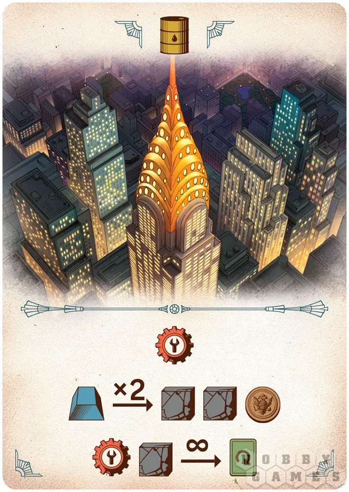 Знакомьтесь с сооружениями и зданиями в новых стилях, собранных со всего света: от конструктивизма до баухауса. Составляйте из жетонов управляющих и текстовых свойств предприятий самые замысловатые комбинации какие только сможете найти! А для этого не поскупитесь на ресурсы в противостоянии за необходимые вам карты.