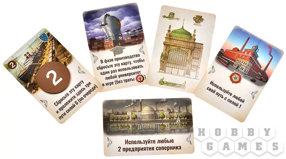 В правилах игры вы также найдёте вариации, призванные усложнить процесс для более опытных игроков. Кроме того, стоит отметить красочные иллюстрации на картах предприятий. Для многих из них основой стали изображения реальных промышленных комплексов рубежа XIX–XX веков. Они стали архитектурным гимном эпохи инженеров и предпринимателей, пара и электричества, первых автомобилей и трансконтинентальных железных дорог.