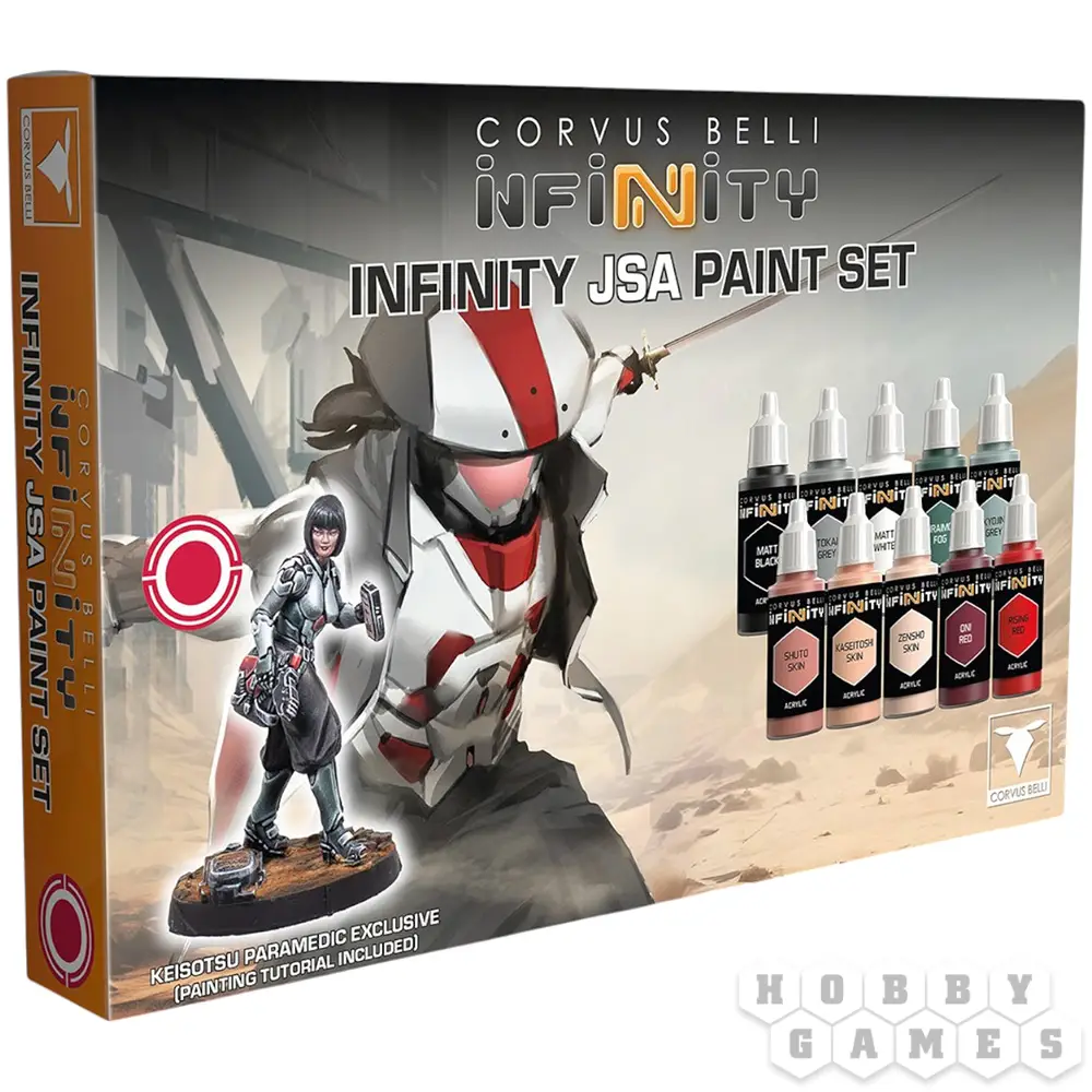 Этот набор позволит вам использовать все необходимые цвета для раскрашивания моделей, принадлежащих фракции JSA. Внутри вы найдёте 10 красок, которые понадобятся вам для придания своим миниатюрам фирменного цвета фракции, а также эксклюзивную миниатюру Keisotsu Paramedic, которой нет нигде, кроме этого набора. Вы также найдете 10 цветов, которые понадобятся вам для раскрашивания вашей армии JSA.