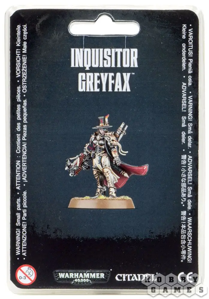 Этот многокомпонентный пластиковый набор содержит детали, необходимые для сборки Инквизитора Грейфакс (Inquisitor Greyfax). Она облачена в искусно изготовленный силовой доспех, богато украшенный различными деталями – инквизиторские инсигнии, черепа и резные печати. Грейфакс вооружена специальным болтганом, сочетающем в себе мощь имперского болтера и надствольного арбалета, заряженного освященными болтами, – действительно мощное оружие против отродий варпа. Из-под силового ранца с различными датчиками и дюзами выглядывает мастерский силовой меч. Инквизитор носит широкополую шляпу, которая полностью соответствует её образу, и Псиоккулум, Глаз Императора (Psyocculum, the Eye of the Emperor) на её лице.