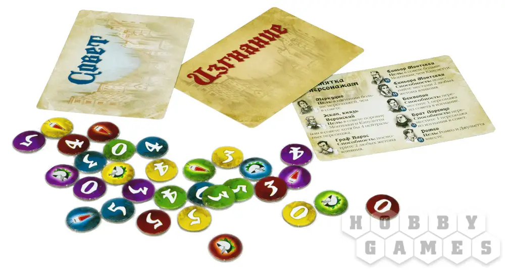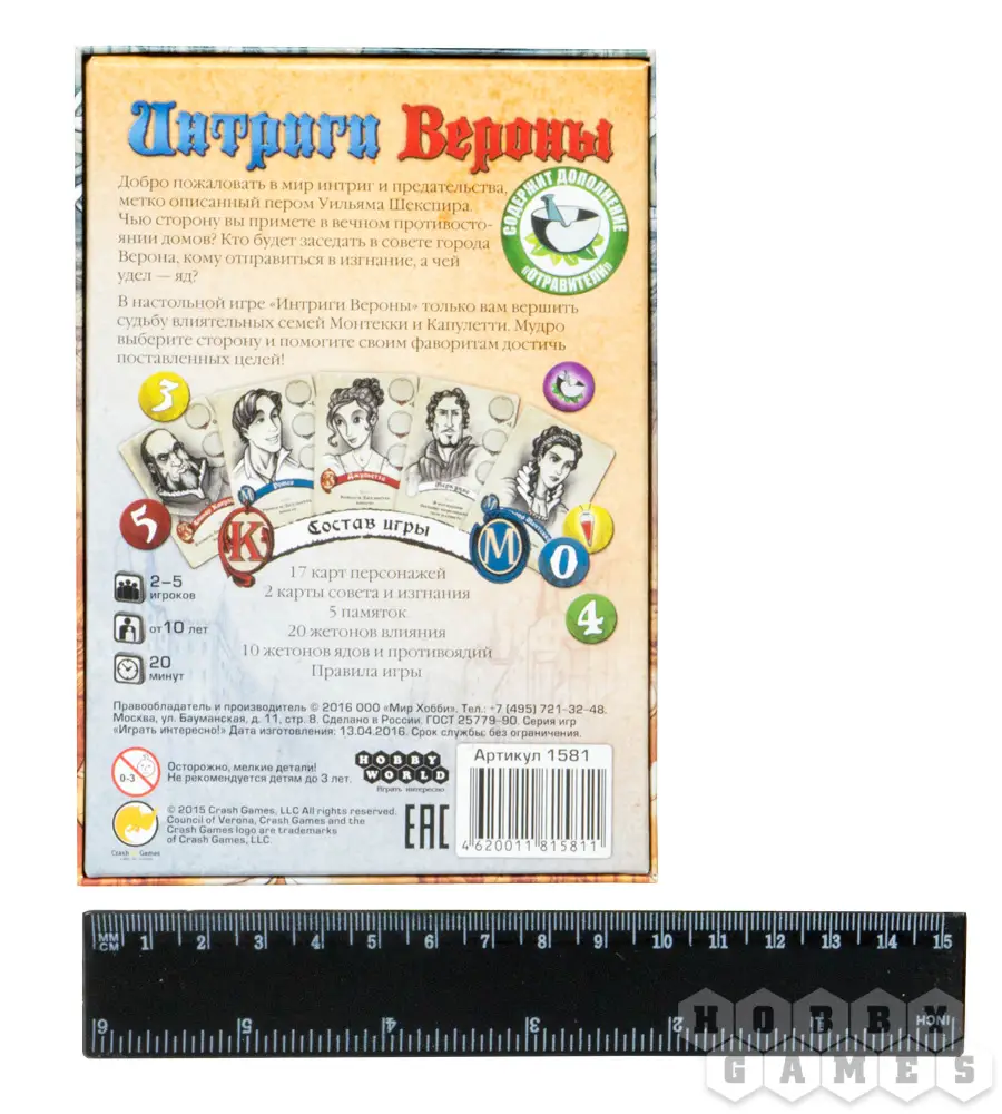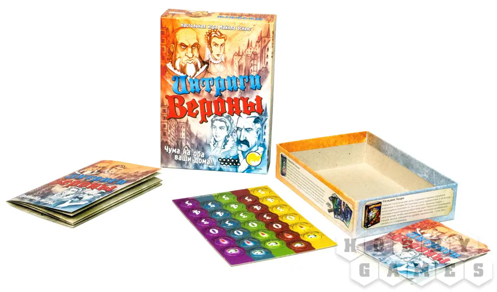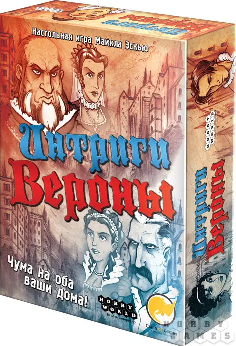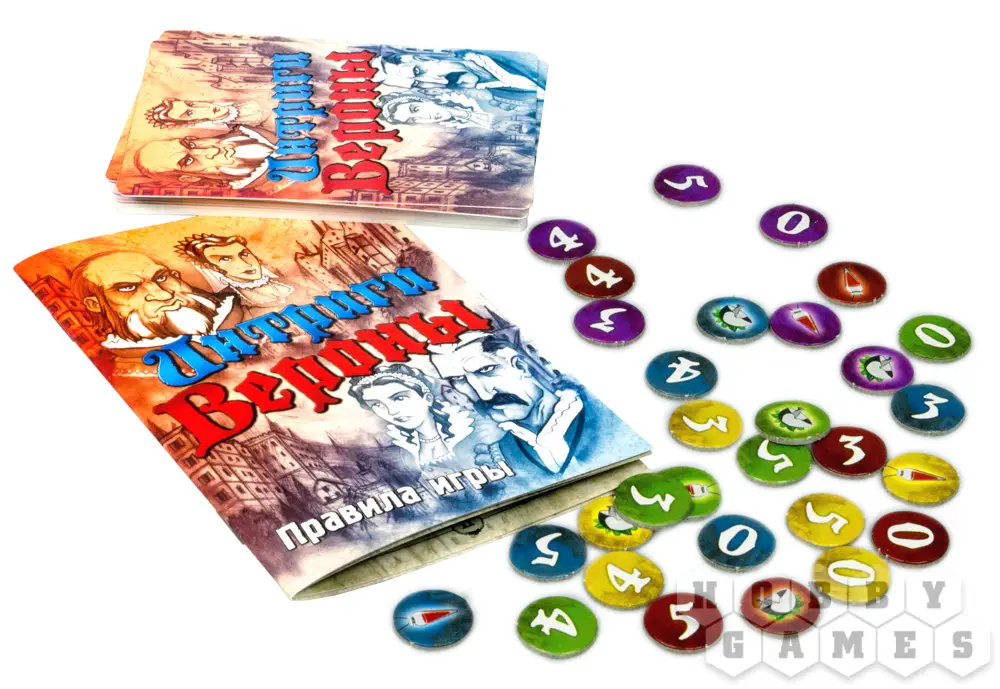 Настольная игра «Интриги Вероны» — это карточная игра про хитросплетения интриг и холодный расчёт, отдалённо напоминающая всем известный хит «Цитадели». Игра предлагает вам семнадцать различных персонажей: Ромео и Джульету, Синьоров Монтеки и Капулетти, князя Веронского, Меркуцио и прочих. У каждого из них — своя цель и свои способности. Главы семей, например, стремятся к процветанию своего дома с помощью доминирования в совете, а любовники лишь мечтают быть вместе хоть на краю мира! Ловко маневрируя и предугадывая ходы противников, вы сможете точно рассчитать, как будет выглядеть совет, кто уйдёт в изгнание, кто из персонажей сможет выполнить свои цели, а кто нет — делая верные ставки (желательно быстрее ваших соперников), вы сможете заработать победные очки и выбраться из этого омута интриг победителем!