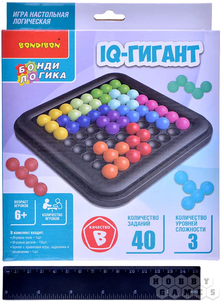 Головоломка "IQ-Гигант" представляет собой набор причудливых разноцветных фигур, собранных из множества шариков. Задача игрока – расположить фигуры на поле определённым образом согласно заданию. То есть, известен только конечный результат, к которому игрок должен прийти сам. Это увлекательная игра для детей, которая привлечёт внимание своей яркостью и необычными фигурами. Она отлично развивает пространственное мышление, концентрацию внимания и зрительное восприятие форм и объектов. 40 разнообразных заданий не дадут заскучать, а постоянно повышающаяся сложность задач натренирует полезные навыки ребёнка. Удобное поле с крышкой и компактный формат самой головоломки позволят легко взять её с собой в дорогу.