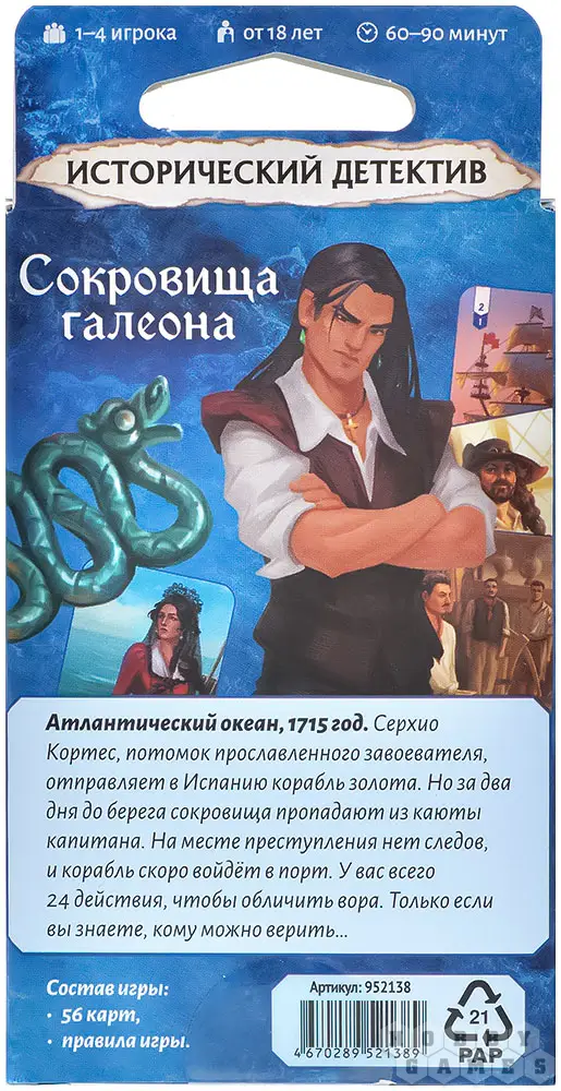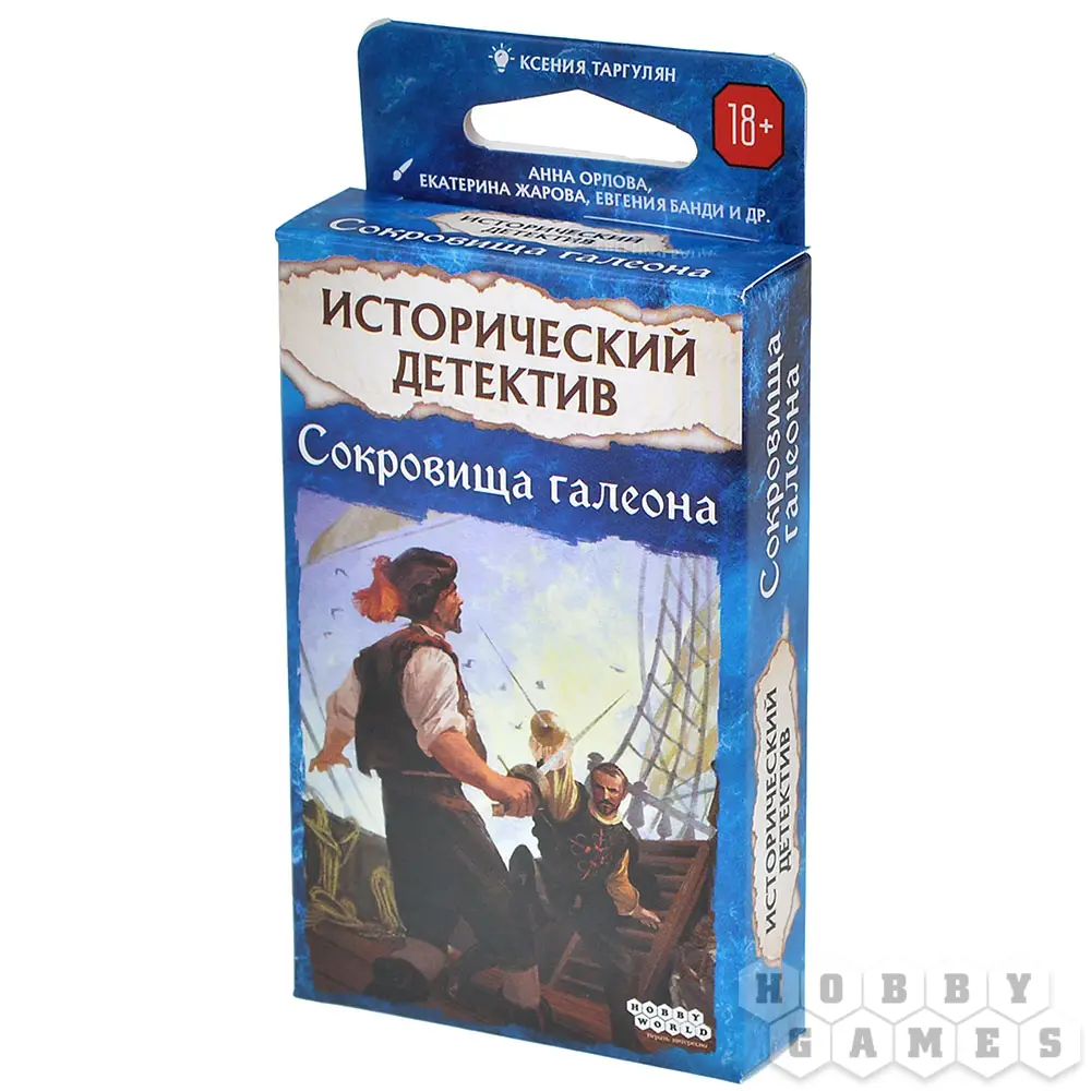 "Сокровища галеона" – настольный детектив с атмосферой исторического приключения, где вы расследуете кражу на борту испанского галеона. Игра рассчитана на компанию от одного до четырёх игроков. В вашем распоряжении тринадцать колод карт, каждая из которых раскрывает новые улики, диалоги с персонажами и детали обстановки. Уникальность игры – в её визуальной составляющей: иллюстрации полны скрытых подсказок, а эмоции персонажей помогают понять, кто лжёт. Механика действий добавляет напряжённости – каждое решение должно быть взвешенным. Вы будете разгадывать тайну, переворачивая карты, но будьте внимательны: некоторые из них требуют затраты действий, а другие открываются бесплатно. В конце игры вас ждёт финальный тест – сканирование QR-кода с вопросами, где вы проверите свою интуицию и логику.