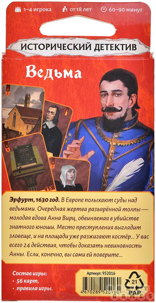 В игре "Исторический детектив: Ведьма" игроки берут на себя роли сыщиков, которым было поручено расследовать это нелёгкое дело. Для проведения партии понадобится мобильный телефон с функцией чтения QR-кодов – это необходимо, чтобы в финале определить, насколько ваши догадки близки к истине.