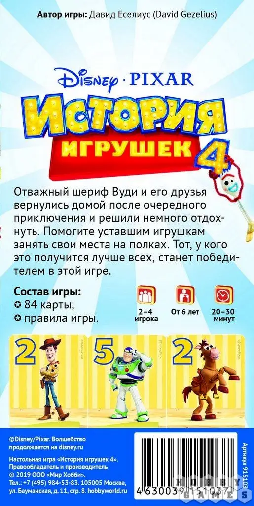 В игре "История игрушек 4" вы сможете собрать полки, наполненные любимыми игрушками – героями мультфильма. На игровой стол выкладываются восемнадцать карт, и игроки по очереди берут себе любую, образуя тем самым новую полку. На каждой полке можно размещать игрушки только одного цвета и для получения всех очков полку необходимо закончить картами со специальными обозначениями или перевернув любую. Но не переживайте, если не закончили полку, просто уберите последнюю карту, а остальные возьмите в зачёт.