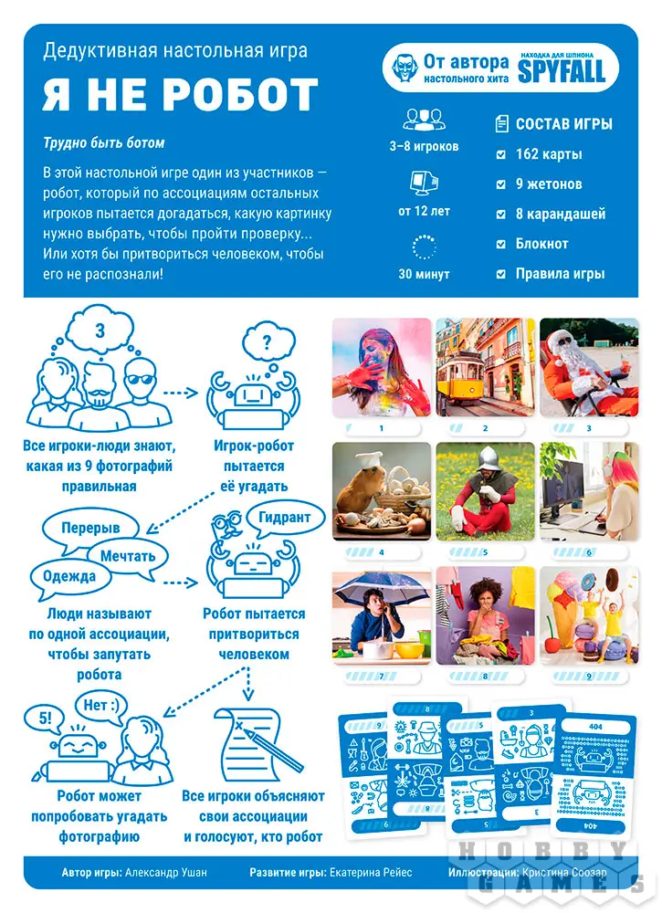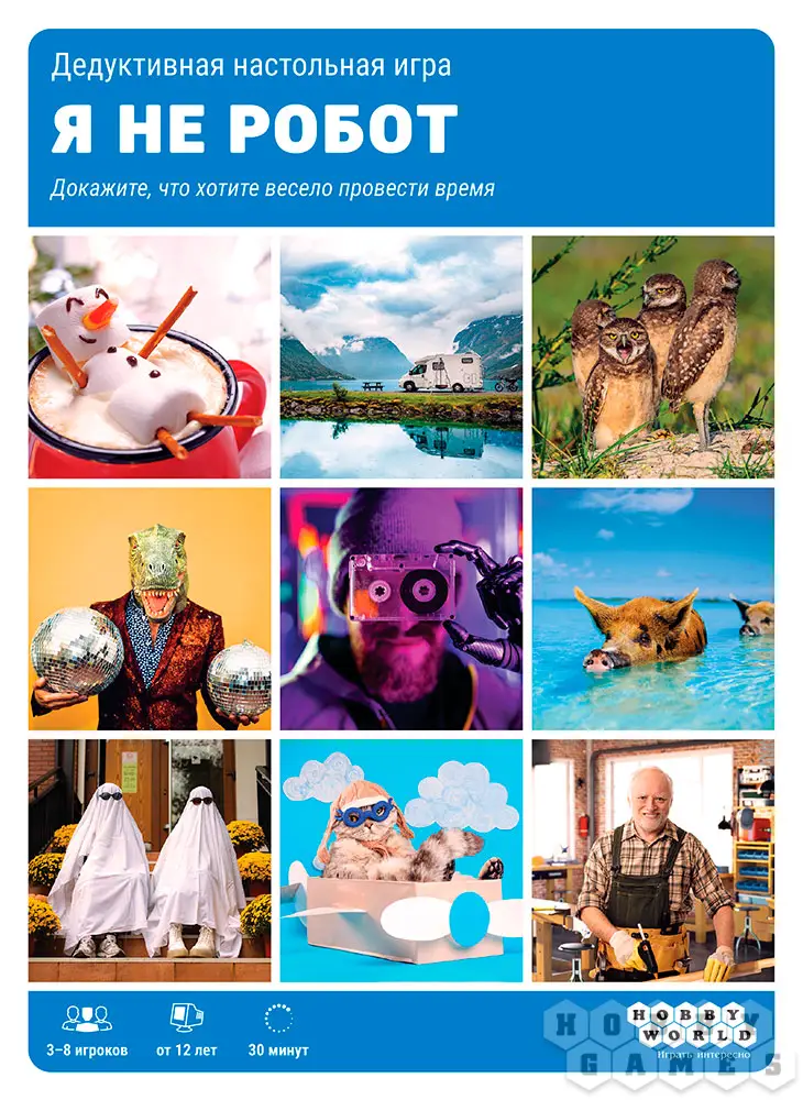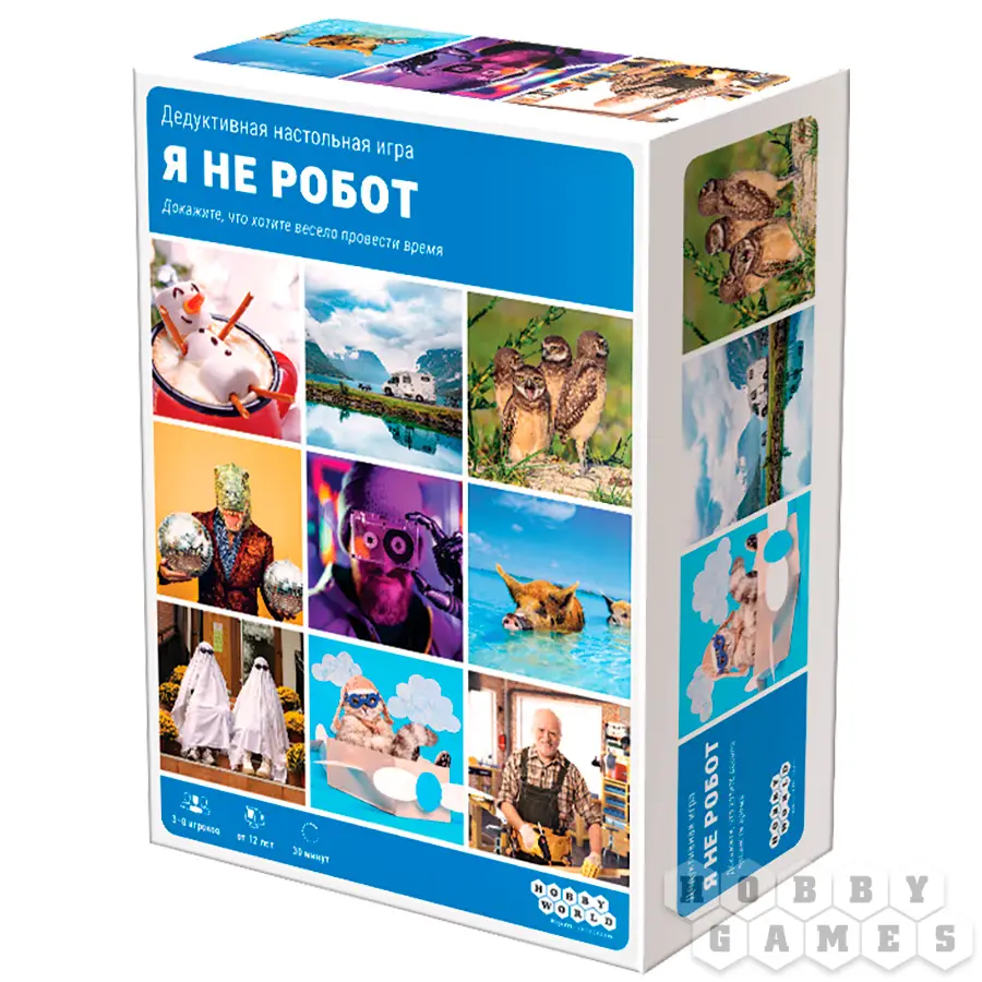 "Я не робот" – это простая и весёлая настольная игра для компании от 3 до 8 человек, в которую можно быстро сыграть на вечеринке с друзьями или в небольшом семейном кругу. Каждый из игроков остаётся самим собой – человеком, в то время как один из них становится роботом. Но кому досталась это роль, не знает никто, кроме самого робота. Всем участникам будет загадано одно из нескольких изображений, прямо как в настоящей капче, вот только роботу изображение будет неизвестно.