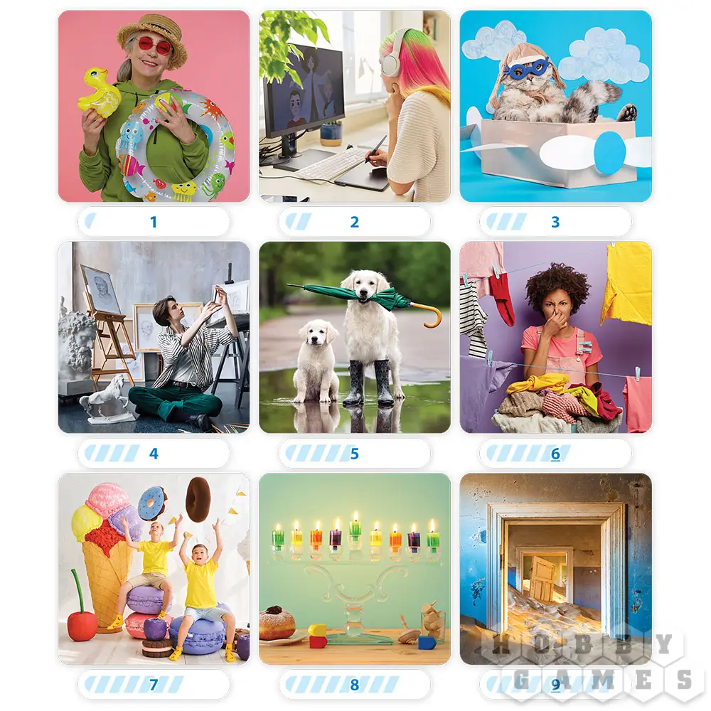 На стол выкладываются 9 изображений, а под каждым из них кладётся жетон с номером от 1 до 9. Перемешайте пакетики с колодами и выберите один случайным образом. Достаньте карты, чтобы никто не видел цифру на них. Карту с синей рубашкой, не открывая, отложите в сторону – это карта правильного ответа. Снизу оставшейся колоды отложите карты в количестве на одну больше числа игроков. Остальные уберите в пакетик. Перемешайте карты, раздайте взакрытую игрокам, а последнюю положите (тоже взакрытую) к карте с синей рубашкой – это карта сервера.