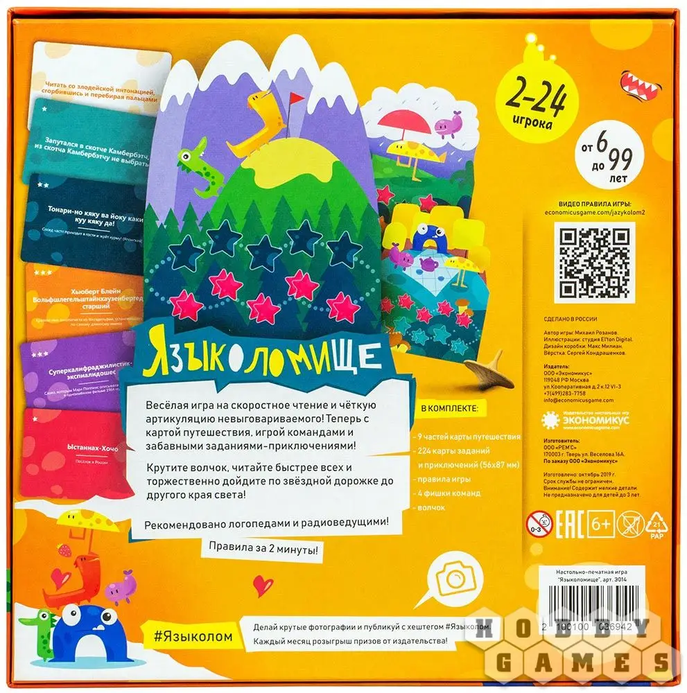 Языколомище – весёлая игра на скоростное чтение и чёткую артикуляцию невыговариваемого! Продолжение популярной игры Языколом – с новыми забавными скороговорками, а ещё с картой путешествия, игрой командами и заданиями-приключениями! Крутите волчок, читайте быстрее всех и торжественно дойдите по звёздной дорожке до другого края света! Рекомендовано логопедами и радиоведущими!