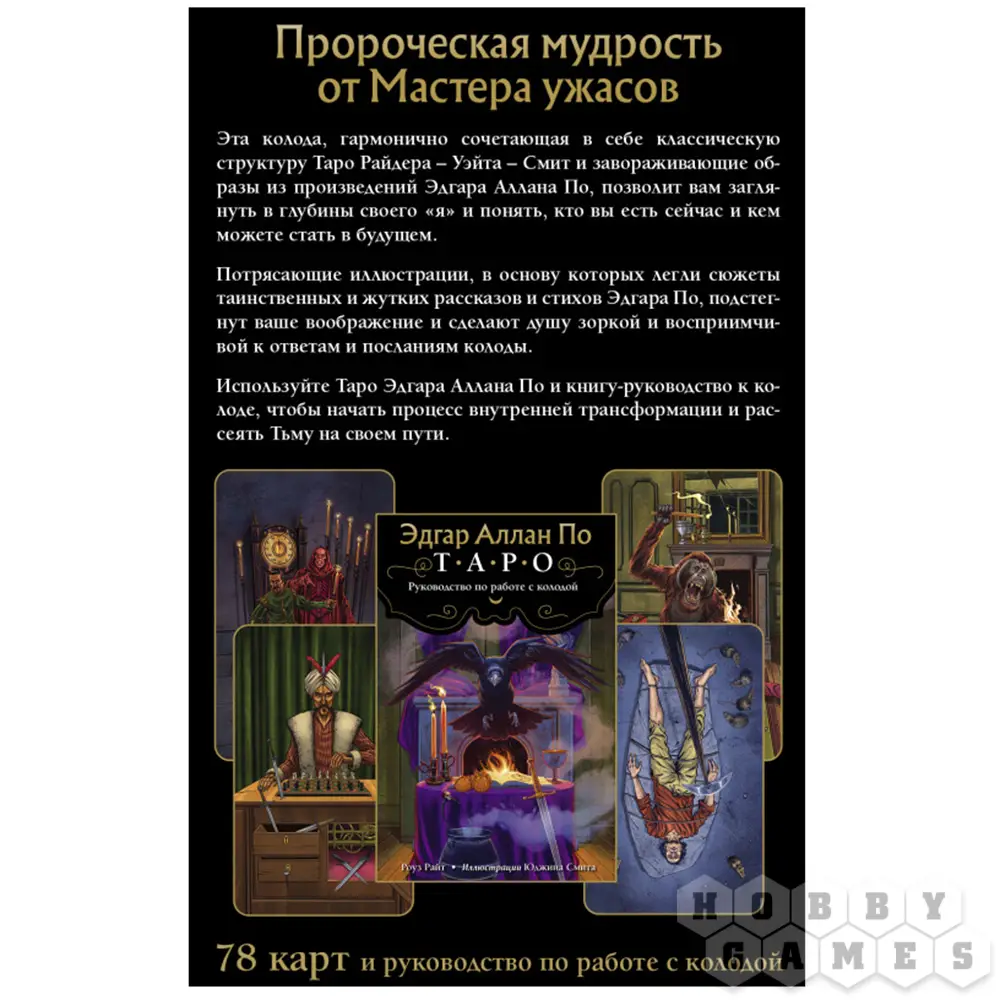 Таро Эдгара Аллана По – это идеальное сочетание классической структуры Таро Артура Уэйта и иллюстраций, основанных на мистике стихов и рассказов потрясающего писателя Аллана По. Колода подойдет как опытным тарологам, так и новичкам. Подробное руководство, составленное профессионалом Таро Роуз Райт, содержит описание всех карт, авторские и классические расклады и общие рекомендации по работе с колодой.