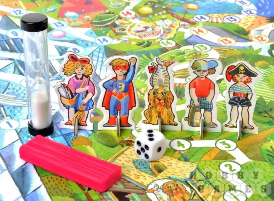 Чтобы привести все фишки на пикник в центре поля, нужно объяснять друг другу и вместе отгадывать разные смешные слова весёлыми способами. Отгадали – берите любую фишку и ведите ее вперёд.