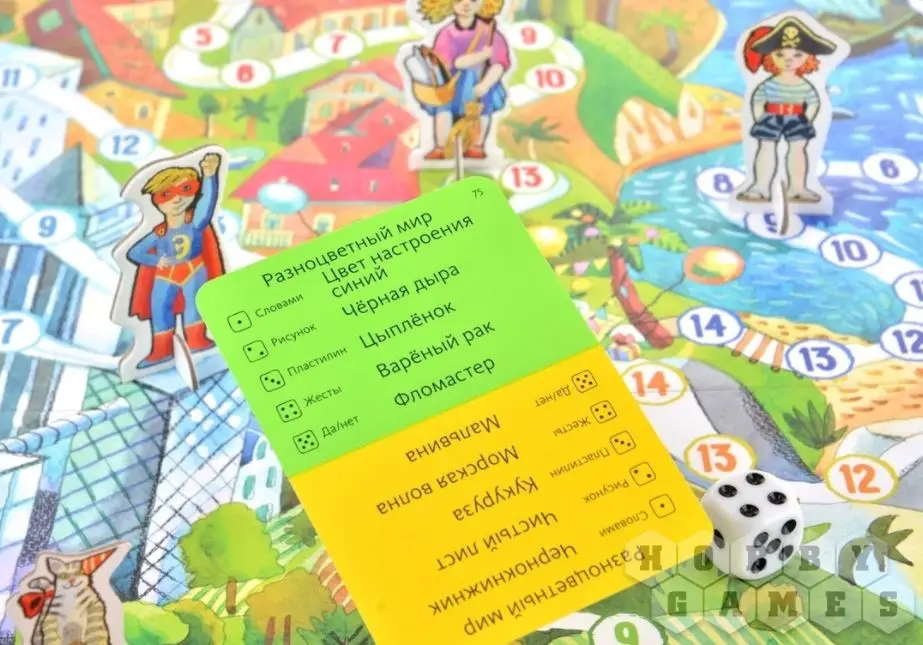 Можно ходить любой фишкой. Главное, чтобы в итоге все персонажи собрались вместе. Тот, кто отгадывает слово быстрее всех, оставляет карточку себе. В конце партии можно подсчитать, кто тут Король Отличников!
