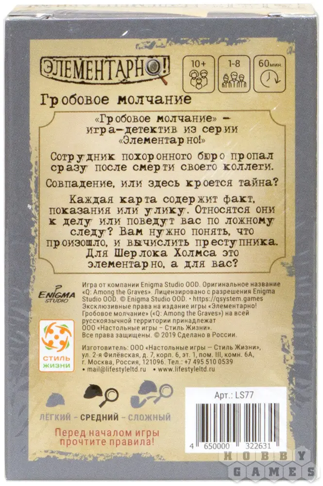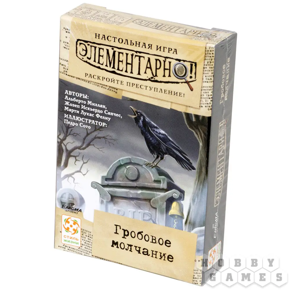 "Гробовое молчание" – это детективная и запутанная история из серии настольных игр Элементарно. Вводные данные следующие: один из работников похоронного бюро трагически погиб, а второй пропал сразу же после его смерти. Совпадение или злой умысел? Тяните карту и начинайте расследование...