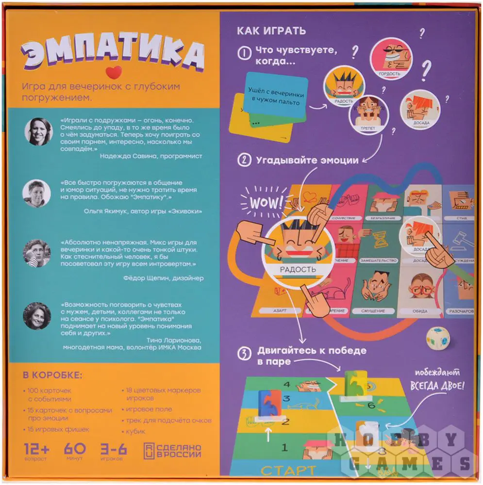 "Эмпатика" – игра для весёлой компании, в которой вы узнаете, насколько совпадают ваши эмоции и чувства! Каждый раунд ведущий будет определять ситуацию при помощи нескольких колод карт. В игре представлены самые разные щекотливые ситуации, что способны вызвать множество эмоций: как бы вы отреагировали, если бы осознали, что ушли с вечеринки в чужом пальто? А если бы ненароком утопили телефон в унитазе, что бы чувствовали: обиду, печаль, замешательство, гнев или что-то ещё?