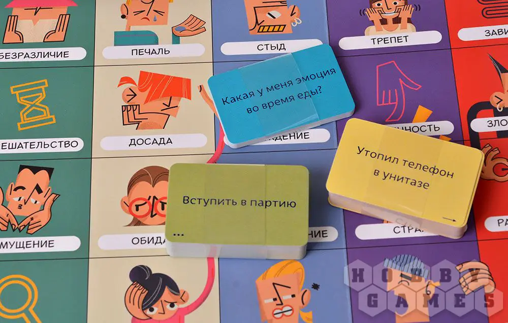 Каждый игрок втайне от других отмечает, какую эмоцию из представленных 28 вызывает озвученная ситуация, после чего все одновременно ставят фишки на ячейки эмоций. Игроки, чьи эмоции совпали, получают победные очки!