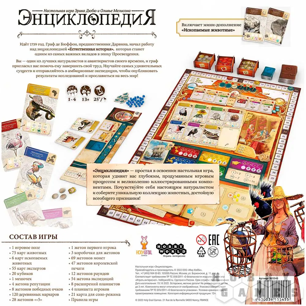 "Энциклопедия" – это настольная игра с достаточно низким порогом вхождения, чтобы её мог освоить не самый искушённый настольщик, но при этом глубина игрового процесса сохраняется на высоком уровне. Красивые иллюстрации, которые оформляют буквально каждый компонент игры, позволят игрокам ощутить всю атмосферу приключений и почувствовать себя настоящими натуралистами. Попробуйте собрать самую уникальную коллекцию животных и получите признание всего мирового сообщества!