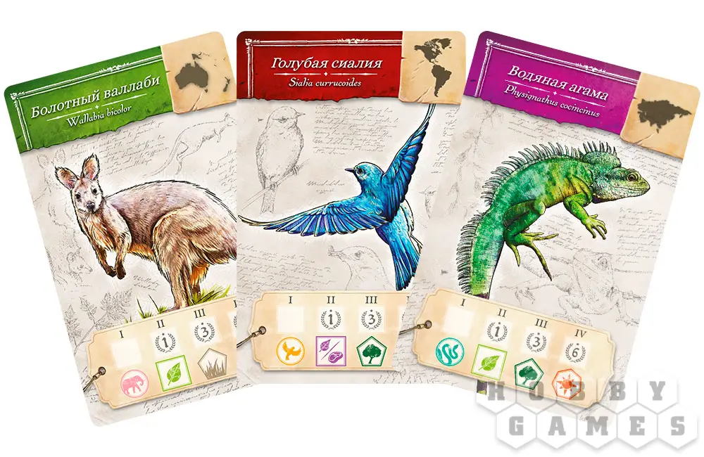 Прежде чем отправиться в экспедицию, соберите предварительные данные о животном, которое хотите изучить. Поместив кубик в академию, выберите карту животного – она добавляется в вашу коллекцию и становится доступна для изучения. Размещённый кубик должен быть того же цвета, что и выбранная карта (разместить красный кубик, а выбрать синюю карту нельзя). А ещё вы получите от 1 до 3 очков репутации в зависимости от значения размещённого кубика.