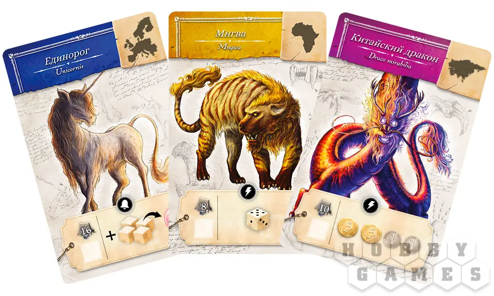 И вот вы определили цель своего путешествия, теперь пора понаблюдать за животными в их естественной среде обитания. На карте животных обозначены части света, в которых они обитают, следовательно, туда вам и нужно отправляться. Для этого разместите в зону экспедиции кубик того же цвета, что и необходимая часть света. Нет нужного цвета? Не проблема: жетоны экспедиции, полученные в посольстве, позволят вам поменять цвет кубика на необходимый. Значение кубика при этом может быть любое, но чем оно выше, тем больше исследований вы сможете провести, если в этой части света обитает несколько животных из вашей коллекции.