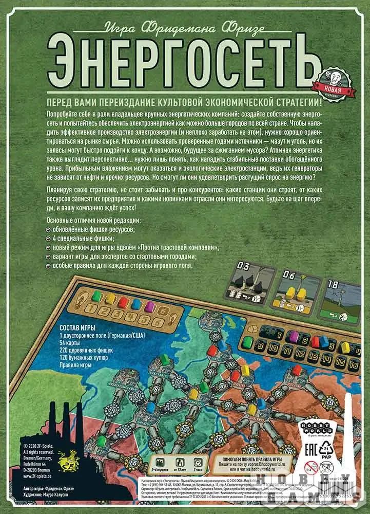 Станьте управляющим собственной энергокомпанией в настольной экономической игре "Энергосеть". Выйти на рынок продажи энергоресурсов в США и Германии очень тяжело, так что вам предстоит приложить немало усилий, чтобы получить заслуженную прибыль. Рискуйте с осторожностью, прокладывайте высоковольтные линии, инвестируйте в амбициозные проекты, и вы наверняка займёте лидирующую позицию в энергетической отрасли. В игре всё покупается и продаётся за специальную игровую валюту "электро". В процессе игры пройдут торги за самые лучшие электростанции, и они стоят того, чтобы их купили! Менеджмент ресурсов имеет ключевое значение в развитии бизнеса и расширения зоны вашего влияния.