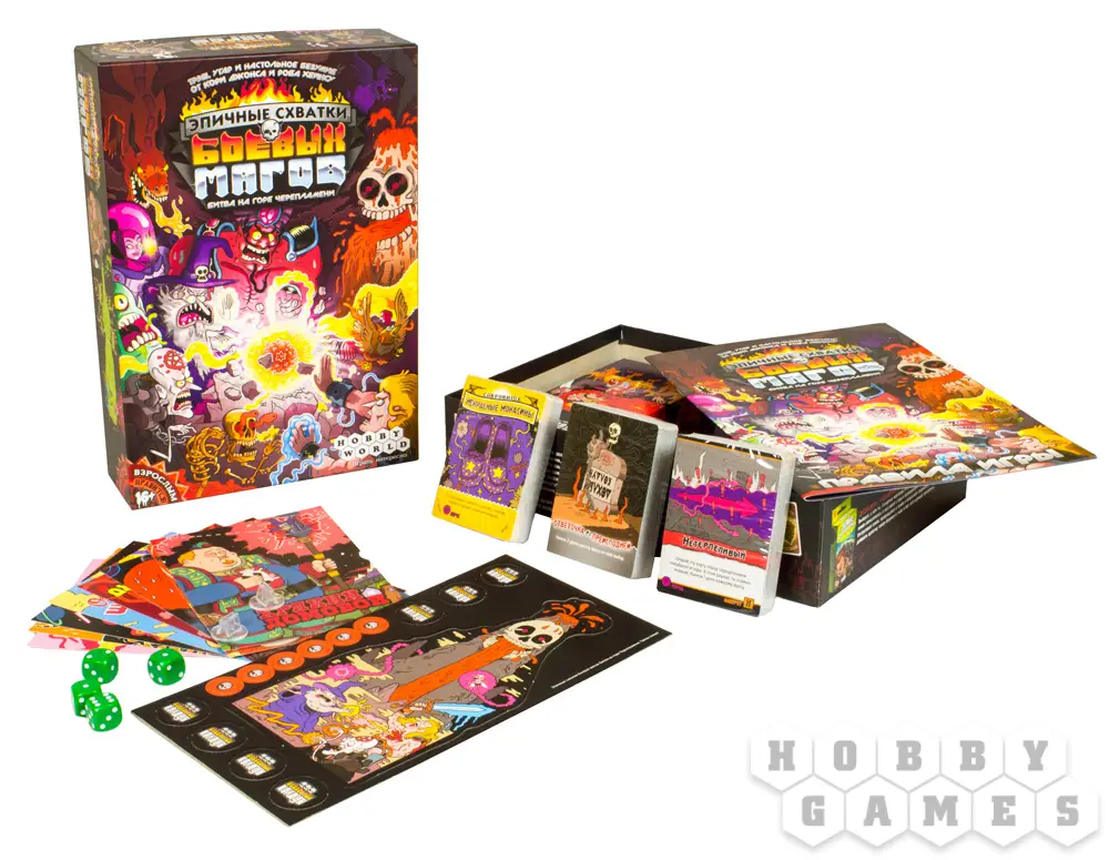 "Эпичные схватки боевых магов: Битва на горе Черепламени" – уникальная по своему стилю карточная игра на составление комбинаций заклинаний. Игра наполнена чёрным юмором и потрясающими иллюстрациями Ника Эдвардса с подчёркнутым садизмом и гротескной жестокостью. Игра компактна и проста в освоении, но при этом подарит вам массу эмоций и настоящего угара! Подобных игр вы ещё не видели, это точно!