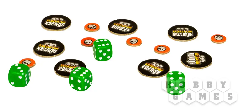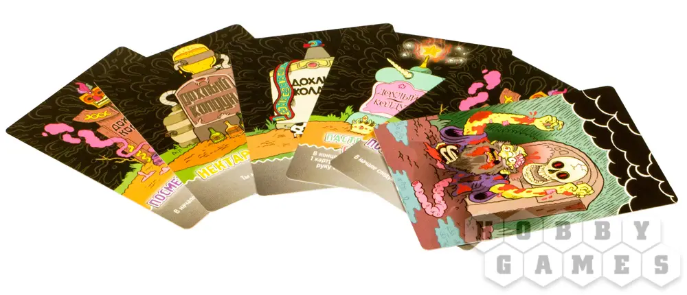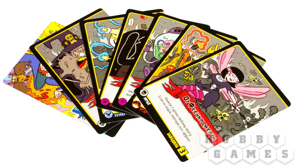 Применяем все эффекты заклинания – эффекты карт применяются по порядку, как выложены карты – сначала Заводила, потом Наворот и затем Приход. Если карта потребует сделать Могучий бросок, то вам нужно будет бросить по одном кубику за каждую карту в заклинании с таким знаком. Всего знаков, то есть школ магии пять: Порча, Мрак, Угар, Кумар, Трава. Все маги в своём порядке применяют эффекты карт и наносят друг другу повреждения