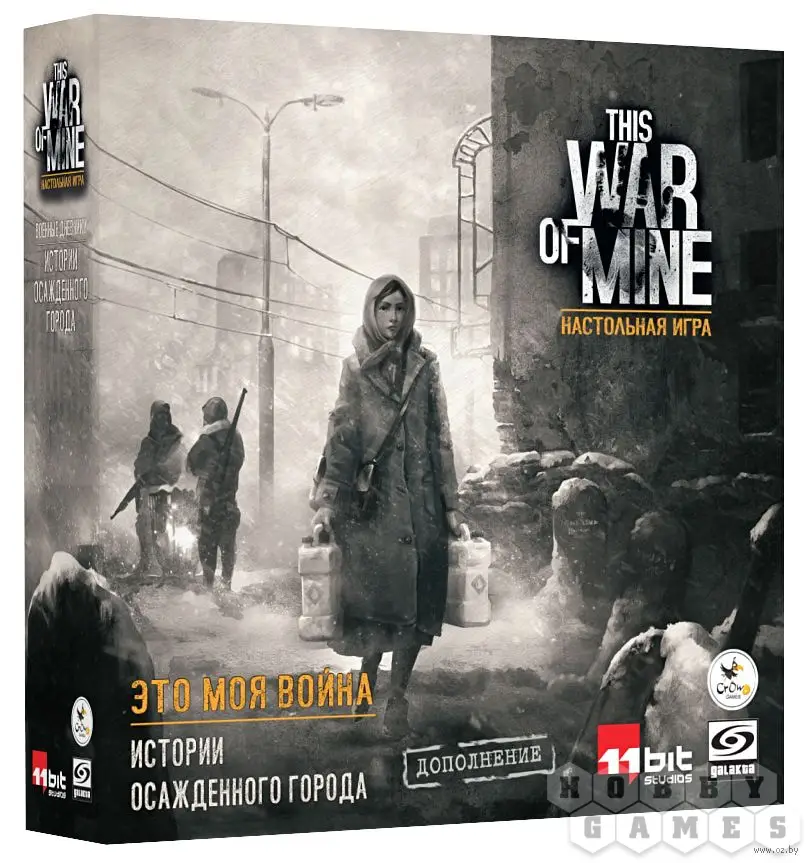 Настольная игра Это моя война – мрачная атмосферная кооперативная игра. В дополнении Это моя война. Истории осаждённого города в городе появятся новые люди. К бандитам, мародерам и агрессивно настроенным военным добавятся и мирные жители, ищущие спасения, и довольно темные личности, рыщущие по улицам по ночам, вооружившись ножами и фонариками. Спастись от всей этой суеты можно, спустившись в подземные катакомбы - там вас не достанут никакие снайперы, но и на особо богатую добычу можно не надеяться. Перемещайтесь по городу, обыскивайте квартиры и покинутые дома, охраняйте свое убежище и постарайтесь выжить любой ценой!