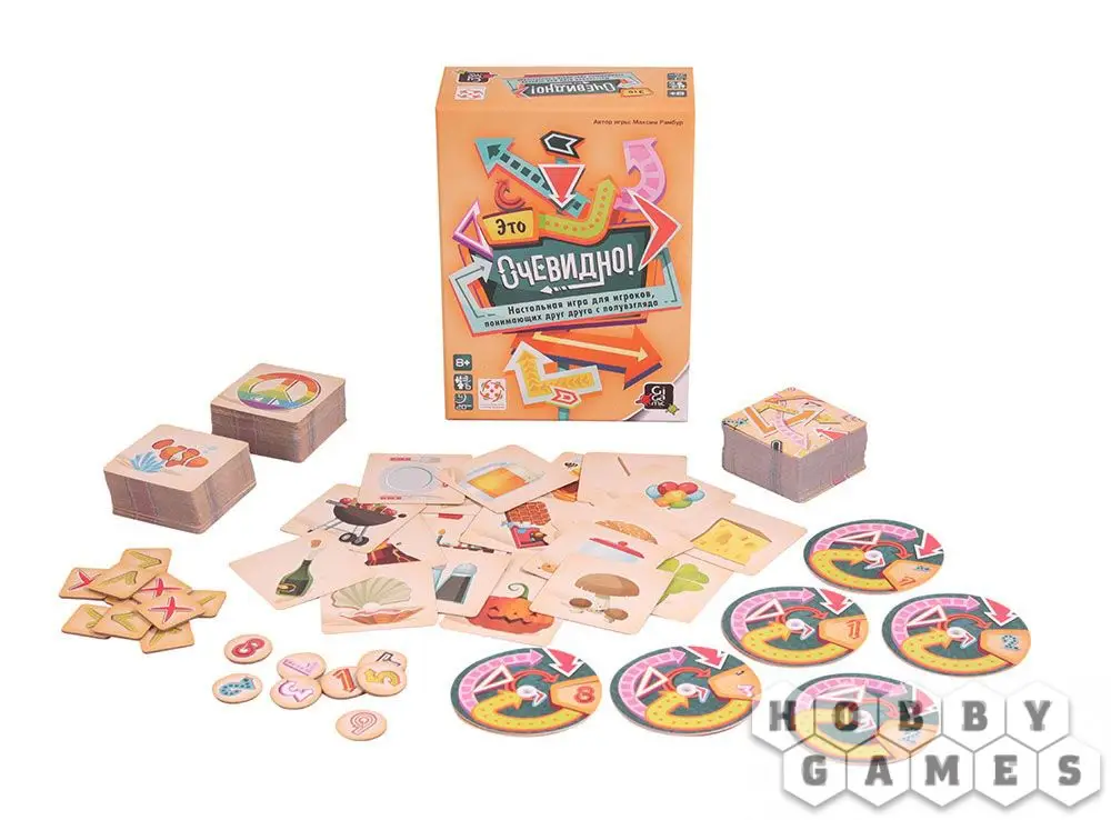 В настольной кооперативной игре "Это очевидно!" вы сможете проверить, насколько хорошо понимаете мысли друг друга. Эта игра на ассоциации к картинкам, во время которой вы не сможете свободно общаться с другими игроками: в центре стола лежат 5 карт, а перед игроками лежат по 2 карты. Вы тайно выбирает одну из карт в центре стола, но ваш выбор не должен совпадать с выбором другого игрока! На первый взгляд очевидный выбор для вас, для другого игрока может показаться абсолютно притянутым за уши. Выбрали карту? Сообщите об этом остальным, сказав "Ну это очевидно!" Далее на диске для голосования вы выбираете номер карты, которая соответствует выбранной вами карте. Если ничей выбор не совпал, поздравляем! Раунд остаётся за вами. Если сплоховали – получаете жетон ошибки, но постарайтесь больше так не делать...