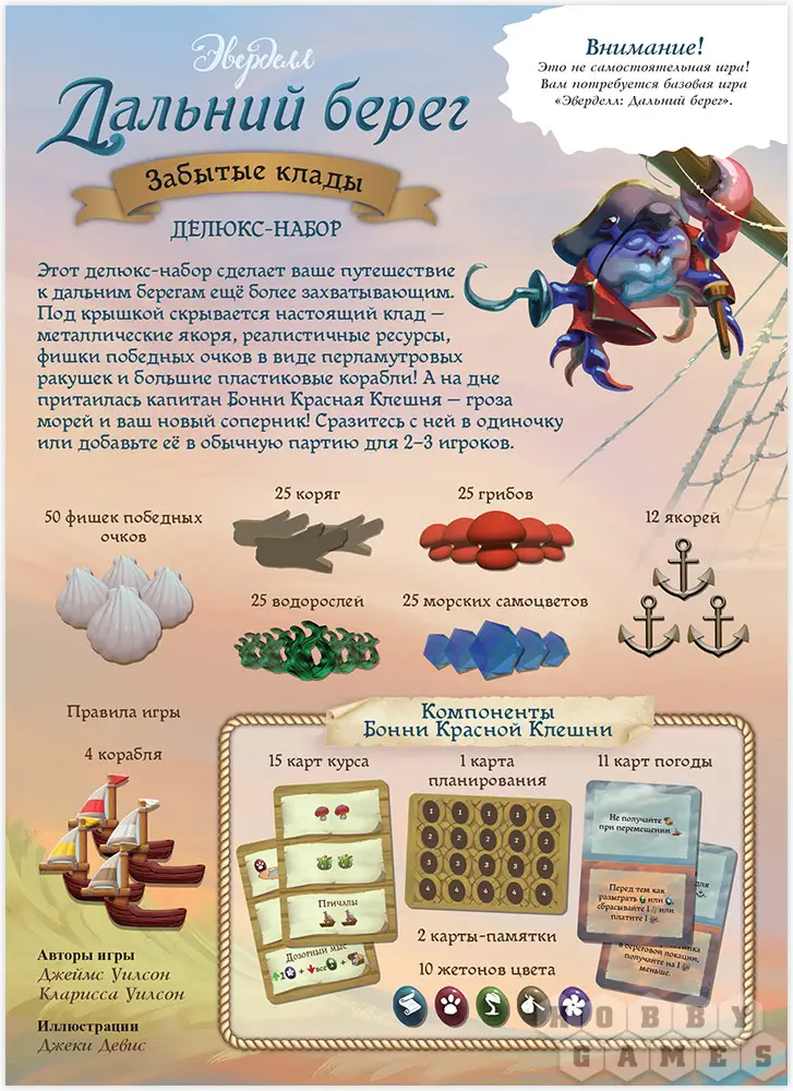 "Забытые клады" – это делюкс-набор, который преобразит ваши путешествия к дальнему берегу в лучшую сторону! Это самый настоящий сундук с сокровищами, под крышкой которого вы найдёте реалистичные ресурсы, большие пластиковые корабли, металлические якоря и перламутровые ракушки, заменяющие жетоны победных очков из базовой игры. Но клад находится под охраной Бонни Красной Клешни, что притаилась на дне коробки: этот грозный противник заставит вас приложить максимальные усилия для достижения победы. Вы можете сыграть против Бонни в одиночку или добавить в партию для 2-3 игроков. Отправьтесь в новые захватывающие приключения за забытыми кладами!