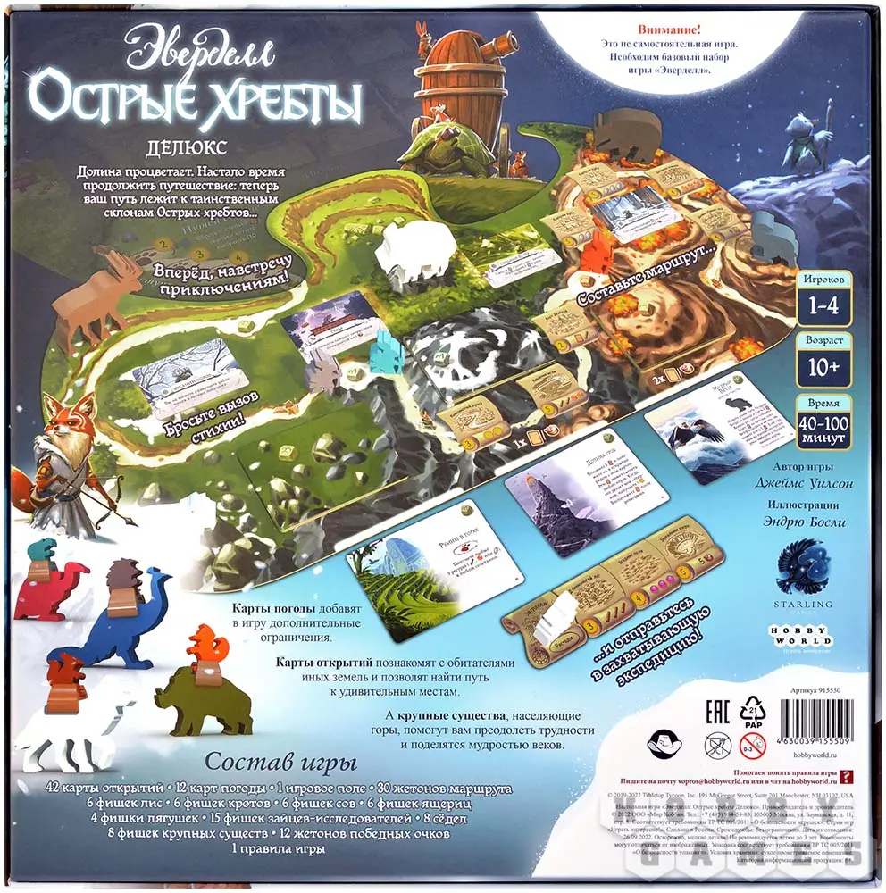 "Острые хребты" – это дополнение для семейной стратегии "Эверделл", которое добавляет в неё новые ограничения и механики. Играть с "Острыми хребтами" сложнее и интереснее – игроки часто будут сталкиваться с нелёгким выбором и выходить из кризисных ситуаций. В дополнении вы найдёте новые фракции, лис и зайцев, карты погоды, которые заставят всех приспосабливаться к новым условиям, и карты открытий, которые помогут проложить путь к новым чудесным местам.